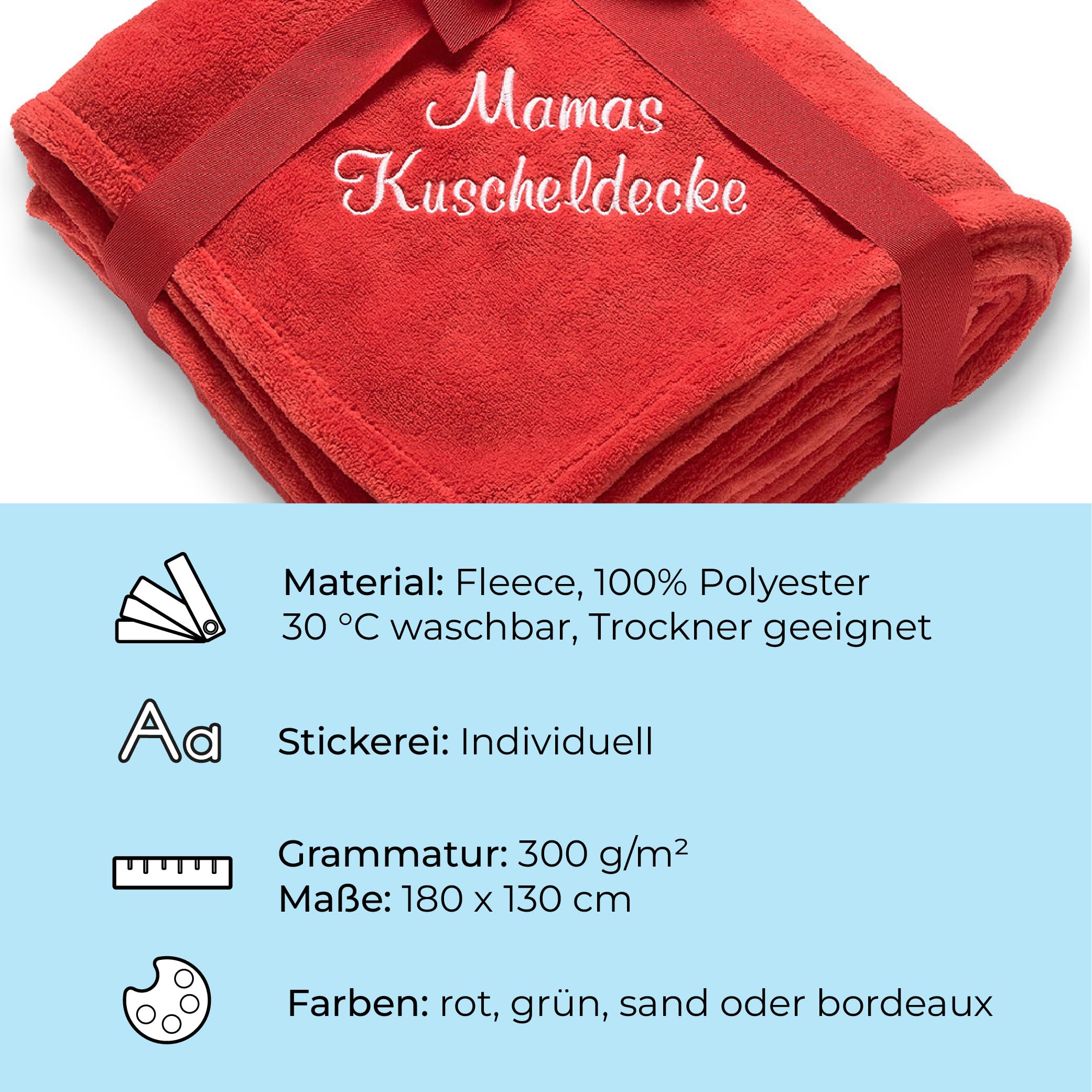 Kuscheliger geht's kaum! Diese wunderschöne Diamandi-Decke in 180 x 130 cm Größe wird in Berlin mit viel Liebe für dich personalisiert. Du kannst jeden beliebigen Text sticken lassen - ob Name, Geburtsdatum oder ein lieber Spruch. Aus weichem Microfleece, das richtig schön warm hält, aber nicht schwer ist. Perfekt für kalte Winterabende auf dem Sofa, als Babydecke für den Kinderwagen oder als gemütliche Begleitung beim Fernsehen. 🧸❤️🌙 Verfügbar in vier tollen Farben: Rot, Grün, Sand oder Bordeaux. Einfach beim Bestellen die gewünschte Farbe auswählen und deinen Wunschtext eingeben. Schon nach wenigen Tagen hast du dieses einzigartige Stück in den Händen. Ob zur Geburt, zum Geburtstag, zu Weihnachten oder einfach so - diese Decke ist immer ein besonderes Geschenk, das von Herzen kommt. Mit Diamandi bekommst du deutsche Qualitätsarbeit von einem Familienunternehmen, das auf jedes Detail achtet!