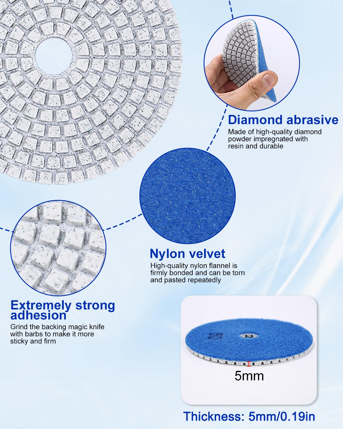 Für alle Heimwerker und Profis: Dieses 14-teilige Diamant-Polierpad-Set ist ein echter Alleskönner! Mit 10 verschiedenen Körnungen von 50# bis 8000# - da ist für jede Arbeit die richtige Scheibe dabei. Perfekt für Marmor, Granit, Beton, Fliesen, Naturstein und vieles mehr. Die Pads haben ein M14-Gewinde und passen auf die meisten Winkelschleifer, Poliermaschinen und Bohrmaschinen. Das coole: Du kannst sie sowohl nass als auch trocken verwenden! Die Gummibasis ist super stabil und der Klettverschluss hält auch bei hohen Geschwindigkeiten sicher. Im Set sind enthalten: 10 Diamant-Polierscheiben, 2 Filzpads für den letzten Schliff, 1 Gummibasis und 1 Bohreradapter. Für optimale Ergebnisse: Bei groben Körnungen (50#-200#) bis 2500 U/min, bei feinen Körnungen (400#-8000#) nur nass und bis 3500 U/min arbeiten. So bekommst du perfekt polierte Oberflächen ohne Kratzer - ob für die Arbeitsplatte in der Küche oder den Terrassenboden!