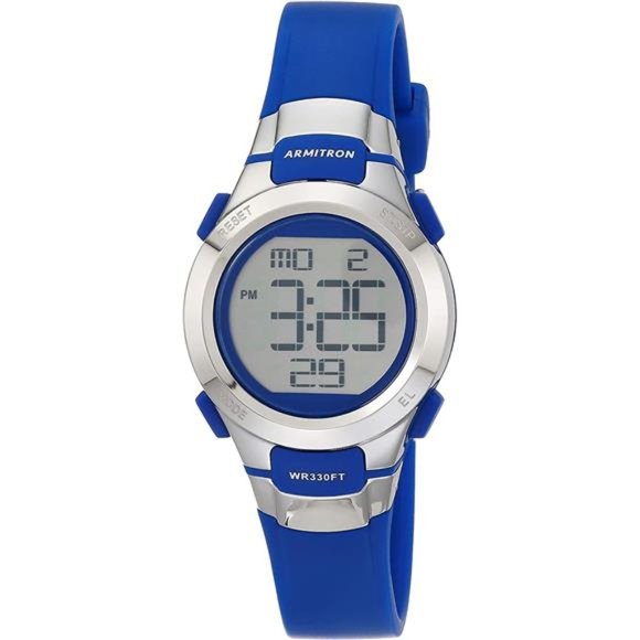 Praktisch und stylisch zugleich! Diese Armitron Digitaluhr für Damen ist der perfekte Begleiter für den Alltag. Mit Chronograph-Funktion, Alarm, Dualzeit und Hintergrundbeleuchtung hast du immer alle Features parat. Das silberfarbene Harzarmband mit Schnallenverschluss sitzt angenehm und sieht dabei noch richtig gut aus. Bis 100m wasserdicht - also kein Problem beim Händewaschen oder Schwimmen. LCD-Display zeigt dir Uhrzeit, Sekunden, Tag und Datum auf einen Blick. Ob beim Sport, im Büro oder in der Freizeit - diese Uhr macht einfach überall eine gute Figur. Qualität, auf die man sich verlassen kann!