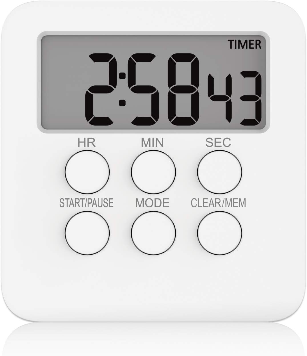 Die großen LED-Zahlen sind super gut ablesbar, auch aus ein paar Metern Entfernung. Mit praktischer Pausentaste, falls mal was dazwischen kommt. Und zwei Lautstärken-Stufen, damit du den Timer auch hörst, wenn's in der Küche mal lauter wird.