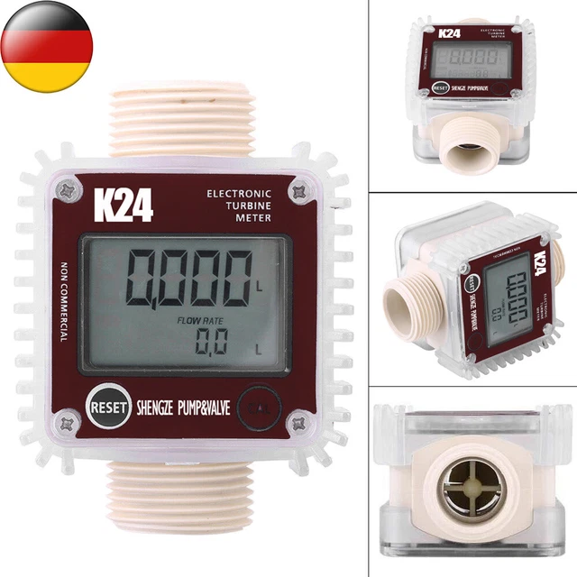 Praktischer digitaler Durchflussmesser K24 für Flüssigkeiten! Misst Wasser, Öl, Kraftstoff, Chemikalien mit ±1% Genauigkeit. 1 Zoll Innengewinde, max. 5 Bar Druck. LCD-Display zeigt Durchfluss und Gesamtmenge an. Einfache Bedienung mit Tasten für Einheitenumstellung (Liter, Gallon, Pint). Läuft mit 2 AAA-Batterien (inklusive). Perfekt für Industrie, Labor oder Hobby - immer den Überblick über deine Flüssigkeitsmengen!