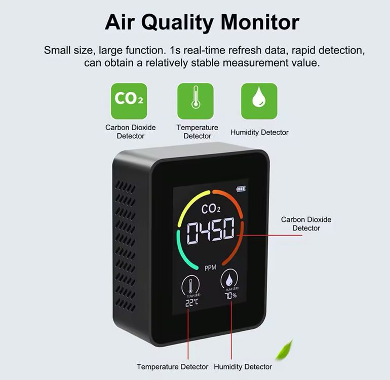Willst du wissen, wie es wirklich um die Luft in deinen Räumen bestellt ist? Dieser CO2 Luftqualitätsmonitor zeigt dir alles, was du wissen musst! Das LCD Display liefert dir Echtzeit-Daten zu CO2, TVOC, HCHO, Temperatur und Luftfeuchtigkeit - alles auf einen Blick. Perfekt für Zuhause, Büro oder sogar für den landwirtschaftlichen Anbau und Gewächshäuser. Das kompakte Design passt überall hin und die Bedienung ist denkbar einfach: Mit den Tasten neben dem Netzschalter passt du die Helligkeit des Displays genau deinen Bedürfnissen an. So behältst du immer den Überblick über dein Raumklima und kannst rechtzeitig reagieren, wenn die Werte nicht optimal sind. Besonders praktisch für Allergiker, Familien mit Kindern oder einfach für alle, die Wert auf eine gesunde Raumluft legen. Einfach aufstellen, einschalten und sofort siehst du, ob gelüftet werden muss oder ob die Luftqualität in Ordnung ist. Mit diesem Monitor hast du dein persönliches Luftlabor immer im Blick!