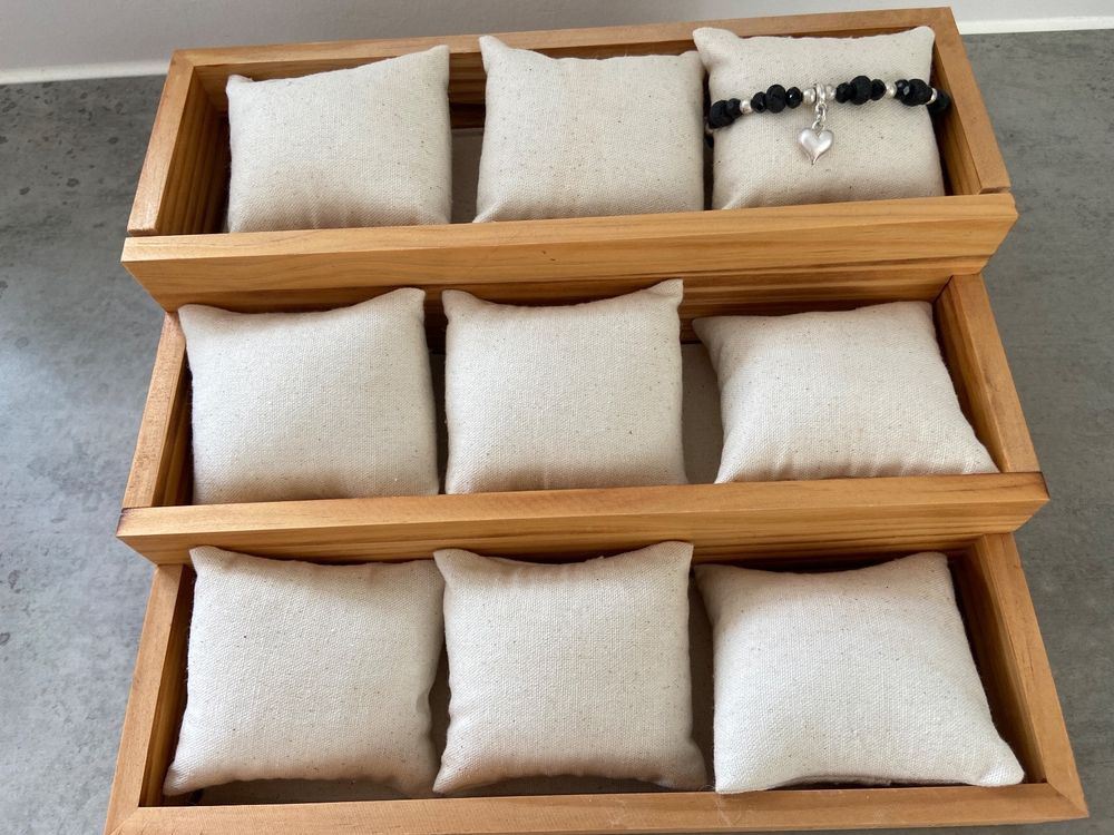 Ordnung und Style für deine Haaraccessoires! Dieser handgefertigte Holz-Ständer ist perfekt, um Armband, Haargummis und andere Beauty-Artikel ordentlich zu präsentieren. In drei Größen erhältlich (S: 15x8cm, M: 19,5x8cm, L: 24,5x8cm) findest du garantiert den passenden Ständer für deine Bedürfnisse. Das Holz ist super glatt handpoliert und die stabile Basis verhindert lästiges Umkippen. Perfekt für den Frisiersalon, aber auch für zu Hause im Badezimmer oder auf dem Schminktisch. So hast du alle deine Accessoires immer griffbereit und übersichtlich sortiert. Das natürliche Holz-Design passt zu jedem Einrichtungsstil und sieht einfach viel edler aus als Plastik-Organizer. Ob für deine eigene Sammlung oder als praktisches Display im Laden - dieser Ständer macht einfach eine gute Figur. Deine Kunden oder Gäste werden beeindruckt sein, wie ordentlich alles aussieht. Einfach hinstellen und sofort mehr Ordnung im Beauty-Bereich!