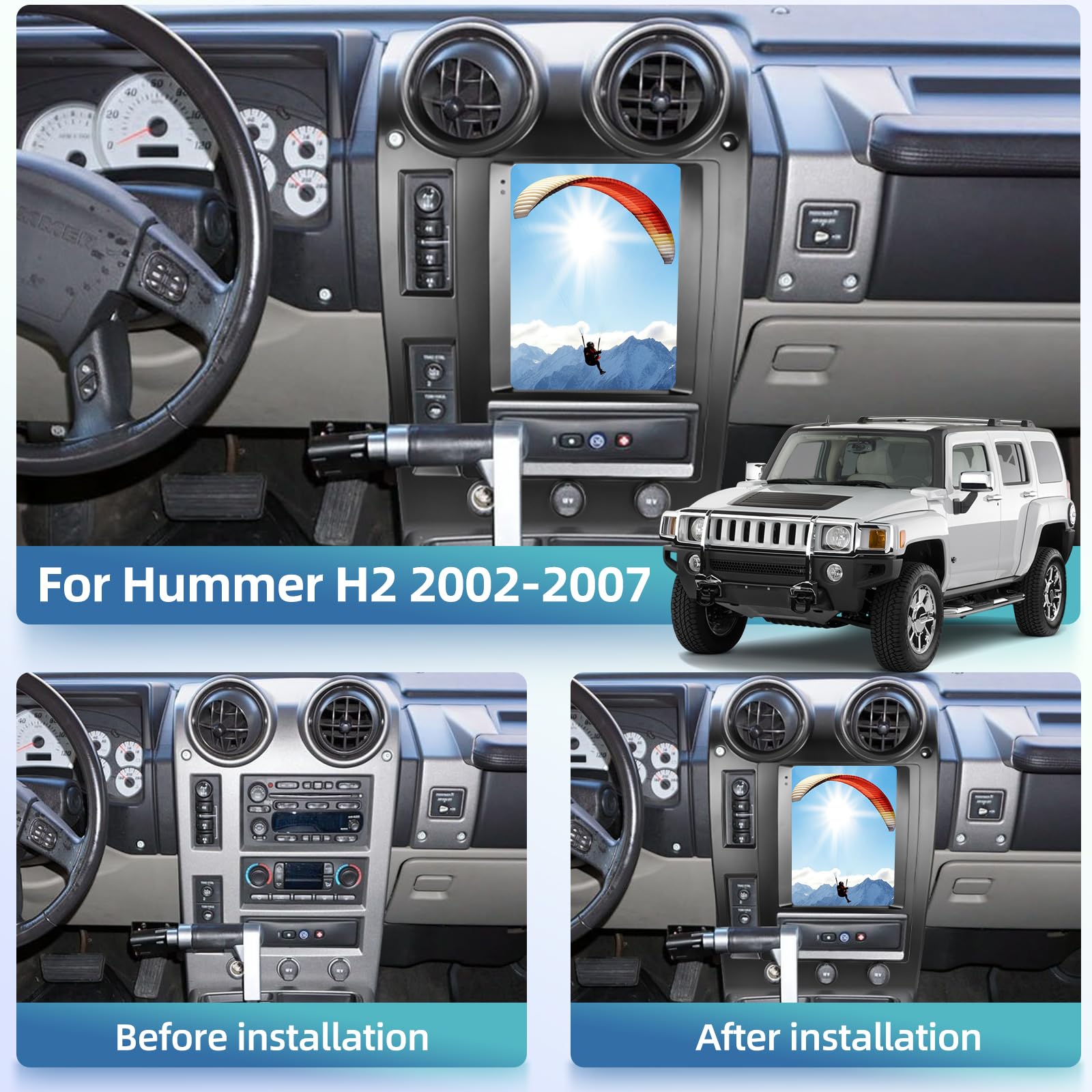 Modernisiere deinen Hummer H2! Dieses ALOEU Android 14.0 Autoradio bringt modernste Technik in dein Fahrzeug von 2002-2007. Mit 9-Zoll Touchscreen, WLAN, Bluetooth und integriertem GPS. Streame Musik, schaue YouTube-Videos oder nutze die Navigation - wie mit einem großen Smartphone. Unterstützt kabelloses CarPlay und Android Auto für volle Smartphone-Integration. Mit Lenkradsteuerung und Canbus für originale Funktionen. Inklusive Rückfahrkamera für mehr Sicherheit. Wichtig: Für den Einbau wird professionelle Hilfe empfohlen. Vor dem Kauf bitte Kompatibilität prüfen - bei Unsicherheit einfach ein Foto der Mittelkonsole senden. Mach aus deinem H2 ein High-Tech Fahrzeug!
