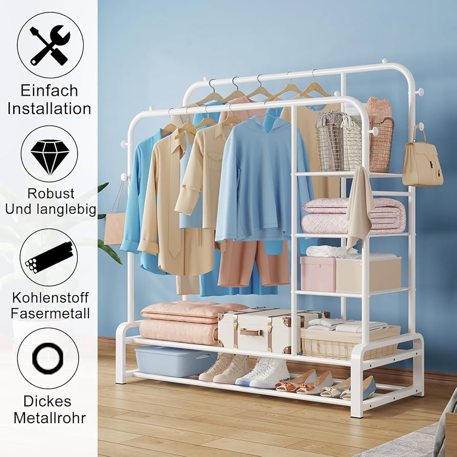 Endlich Ordnung im Schlafzimmer! Dieser super-stabile Kleiderständer von SMILOVII bietet dir alles, was du für eine perfekte Kleiderorganisation brauchst. Mit zwei Kleiderstangen kannst du doppelt so viele Klamotten aufhängen - unten die Hosen und Röcke, oben die Hemden und Jacken. Die 8 seitlichen Haken sind perfekt für Taschen, Mäntel oder Hüte. Und die beiden geräumigen Schuhregale unten bieten Platz für deine Lieblingsschuhe. Aus robustem Metall mit 20 mm dicken Rundrohren hält dieser Ständer auch schwere Winterjacken problemlos aus. Die Anti-Rutsch-Füße schützen deinen Boden vor Kratzern. In nur 30 Minuten ist der Ständer aufgebaut - mit der bebilderten Anleitung und dem mitgelieferten Werkzeug echt easy! Perfekt für Schlafzimmer, Flur oder Waschküche. Ob für deine Alltagskleidung oder saisonale Garderobe - mit diesem Ständer bleibt alles ordentlich und griffbereit. Ein echter Platzwunder für kleine Wohnungen!