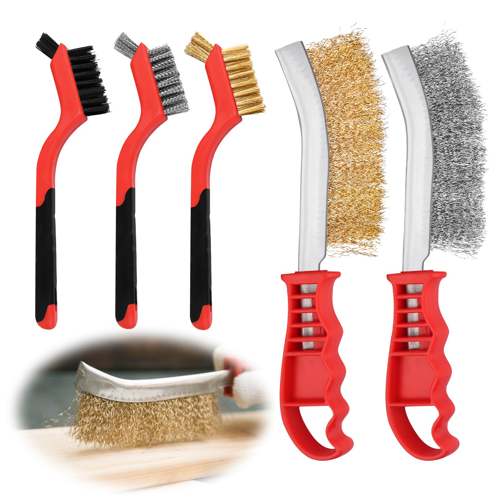 Dieses 5-teilige Drahtbürsten Set ist dein neuer bester Freund bei allen Putz- und Renovierungsarbeiten! Enthalten sind eine große Messingbürste, eine große Edelstahlbürste, eine kleine Messingbürste, eine kleine Edelstahlbürste und eine kleine Nylonbürste - also wirklich alles, was das Herz begehrt.