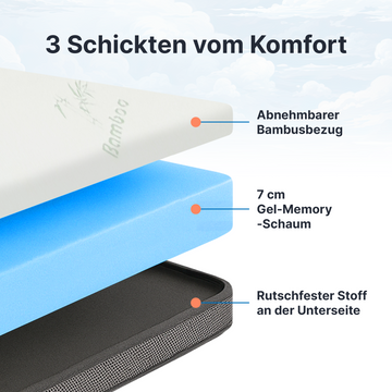Schlaf endlich wieder wie auf Wolken! Dieser Memory Foam Topper in 100x200cm passt sich perfekt deiner Körperform an und entlastet Schultern, Hüften und Rücken. Mit 5cm starkem Gelschaum und kühlendem Effekt verhinderst du Hitzestau und schwitzt nachts nicht mehr. Der atmungsaktive Bezug leitet Feuchtigkeit ab und bleibt immer frisch. Rutschfeste Unterseite und SecureFit-Bänder sorgen dafür, dass der Topper nicht verrutscht. OEKO-TEX und CertiPUR-US zertifiziert - also garantiert schadstofffrei. Bezug abnehmbar und bei 30°C waschbar. Ob Rücken-, Seiten- oder Bauchschläfer - dieser Topper gibt jedem die richtige Unterstützung. Deine alte Matratze fühlt sich an wie neu, aber du sparst dir den teuren Matratzenkauf. Einfach ausrollen und sofort besser schlafen!