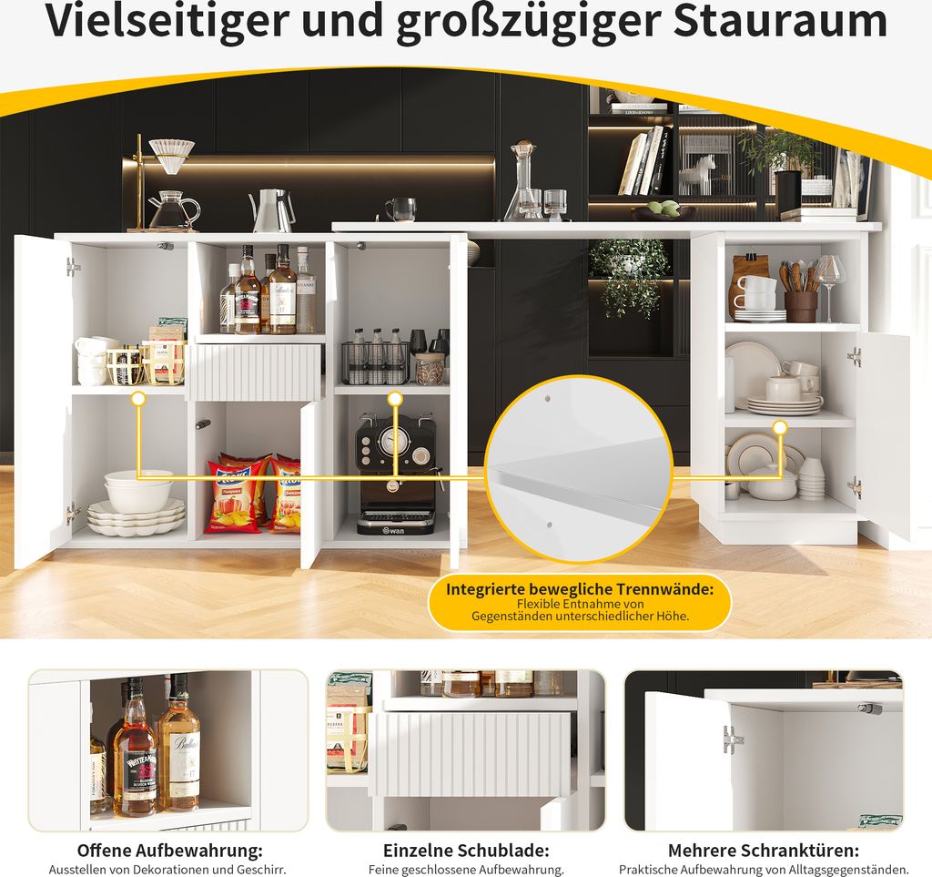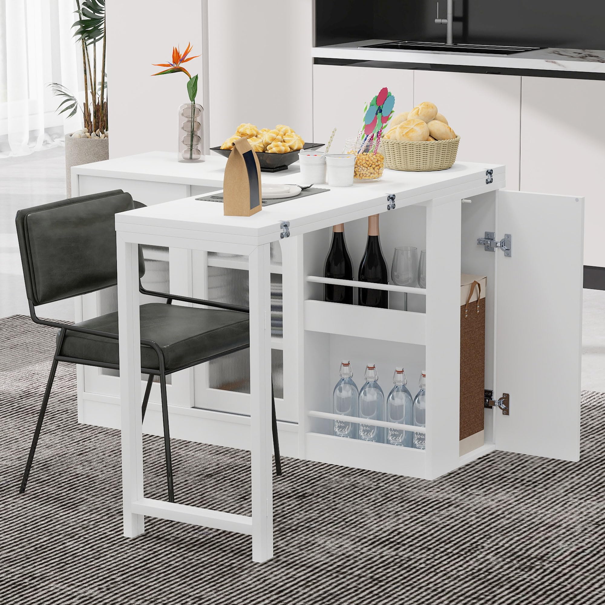 Dieser KAZZIO Bartisch ist wahrhaft genial! Die linke Seitenplatte lässt sich um volle 360° drehen und verwandelt den kompakten Tisch im Handumdrehen in einen geräumigen Esstisch. Perfekt für kleine Räume oder multifunktionale Nutzung! Mit 121,5x40x76,7cm (zusammengeklappt) findet er überall Platz. Der Stauraum ist durchdacht aufgeteilt: eine versteckte Tür auf der rechte Seite für größere Küchenutensilien, zwei höhenverstellbare Einlegeböden, und offene Ablagen für Weinflaschen, Gewürze oder Deko. Aus stabilem MDF + PB + Eisen gefertigt, trägt die Tischplatte 65kg, die eingebauten Regale 15kg und die offenen Regale 10kg. Die stilvollen geriffelten Glasschiebetüren mit Bogen-Design verleihen dem Möbelstück modernen Charme. Montage erforderlich (ca. 1 Stunde), alle Werkzeuge liegen bei. Das Produkt kommt in 2 Paketen - die können auch mal versetzt ankommen. Pflegetipp: Verschüttetes sofort mit sauberem Tuch abtupfen. Ein Möbelstück, das sich deinen Bedürfnissen anpasst!