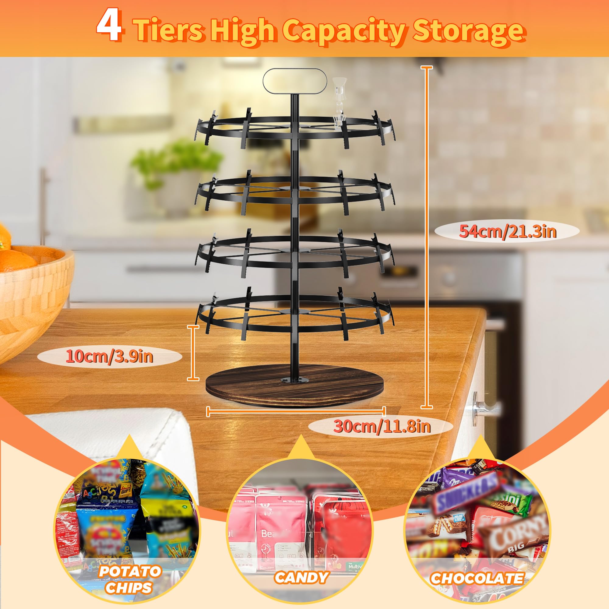Perfekte Snack-Organisation für deine nächste Party! Dieser drehbare Chipständer mit 4 Etagen bietet Platz für alle deine Lieblingssnacks. Mit 48 praktischen Clips kannst du Chipstüten, Süßigkeiten und Schokoriegel ordentlich präsentieren.\\n\\nDas coole 360-Grad-Drehfeature ermöglicht einen einfachen Zugriff von allen Seiten. Einfach drehen und den gewünschten Snack greifen - super praktisch bei geselligen Runden!\\n\\nDer stabile Metallaufbau mit massivem Holzsockel steht sicher und wackelt nicht, auch wenn alle Etagen voll beladen sind. Die beiliegenden Acryl-Clips eignen sich perfekt für Preisschilder oder Beschriftungen.\\n\\nIdeal fürs Wohnzimmer, Büro, Einzelhandel oder für Feiern. Der Tragegriff oben macht den Transport besonders einfach.\\n\\n• 4 drehbare Etagen\\n• 48 Snack-Clips inklusive\\n• Stabiler Metallaufbau\\n• Massiver Holzsockel\\n• Mit Tragegriff\\n• Für Privat & Gewerbe