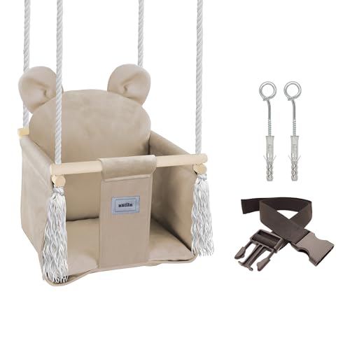 Wunderschöne Holzschaukel für die Kleinsten! Aus 100% Baumwolle und hochwertigem Buchenholz - super weich und hautfreundlich. Mit verstellbaren Sicherheitsgurten und verschließbaren Schnallen - maximale Sicherheit für dein Kind. Die vier Seile und dreieckige Struktur sorgen für absolute Kippsicherheit. Für Kinder von 6 Monaten bis 5 Jahren mit Tragkraft bis 25kg. Perfekt für drinnen und draußen - ob im Garten, auf der Terrasse oder im Kinderzimmer. Das abnehmbare Baumwollpolster ist leicht zu reinigen. Inklusive Tragetasche für einfachen Transport. Fördert Gleichgewicht und Motorik - und macht einfach riesig Spaß! Das perfekte Geschenk für Babys und Kleinkinder!