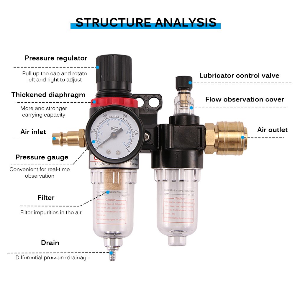 Hey du Hobby-Lackierer und Profis! 🎨 Dieser Wasserabscheider ist ein absolutes Muss für perfekte Lackierergebnisse. Er filtert lästiges Wasser, Rost und andere Verunreinigungen aus deiner Druckluftleitung heraus.\n\nMit Standard-1/4-Gewinde passt er an die meisten Spritzpistolen und Luftleitungen. Das durchsichtige Gehäuse lässt dich sofort sehen, wenn sich Feuchtigkeit sammelt - praktisch, oder?\n\nEinfach in deine Luftleitung einbauen oder direkt an der Spritzpistole befestigen. Das Kondensatablassventil an der Unterseite macht die Entleerung super einfach.\n\nAus Aluminiumlegierung gefertigt und für einen Arbeitsdruck bis 140 PSI/10 Bar ausgelegt. Ob Auto-Lackierung, Möbelarbeit oder industrielle Anwendungen - dieses Teil sorgt für saubere, trockene Luft und damit für einwandfreie Ergebnisse.\n\nKeine lästigen Wasserflecken mehr im Lack! Deine Lackierarbeiten werden damit gleich viel professioneller aussehen. Ein kleines Tool mit großer Wirkung für deine Werkstatt!