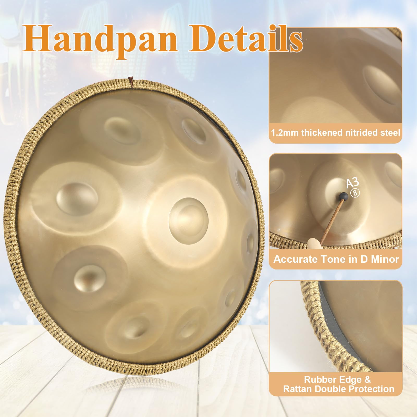 Einfach magisch dieser Klang! Die Derlvbak Handpan Drum in Gold mit 12 Tönen bringt deine Sinne zum Schwingen. 22 Zoll groß, aus 1,2mm Nitridstahl - super stabil und rostfrei. Professionell gestimmt auf 432/440 Hz - jeder Ton klingt klar und präzise. Perfekt für Meditation, Yoga oder einfach zum Entspannen. Der ätherische, lang anhaltende Sound beruhigt den Geist und reduziert Stress. Komplett-Set mit Tasche, Stöcken, Ständer und Lappen - alles dabei für unterwegs. Einfach zu spielen - keine Vorkenntnisse nötig. Ob zu Hause, im Park oder im Studio - diese Handpan schafft sofort eine entspannte Atmosphäre. Ein Instrument, das nicht nur schön klingt, sondern auch die Seele berührt!