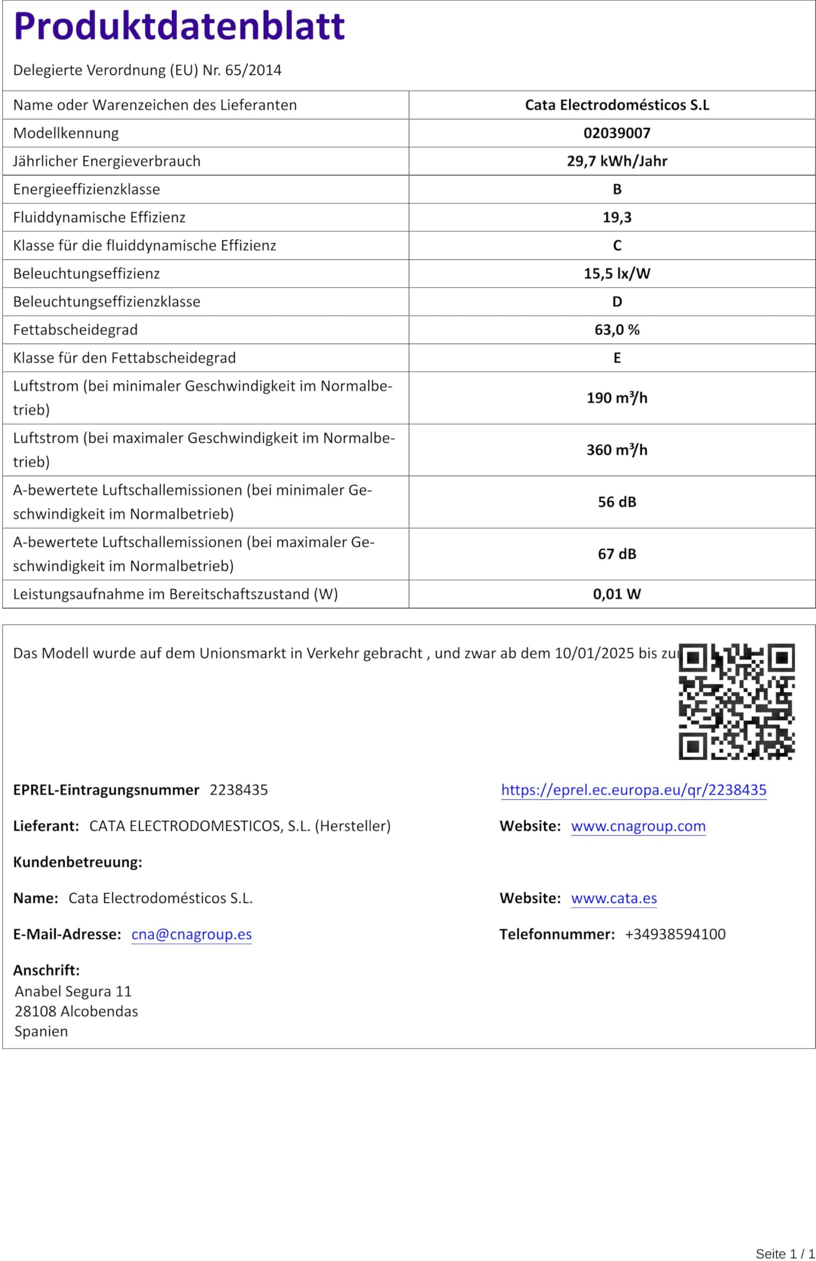 Für eine frische und saubere Küchenluft! Die CATA GK 4500 Dunstabzugshaube in elegantem Weiß vereint hohe Leistung mit energieeffizientem Betrieb. Mit einer maximalen Absaugleistung von 360 m³/h und zwei einstellbaren Absaugstufen entfernt sie zuverlässig Kochdünste und Gerüche. Der hocheffiziente K11-Motor mit nur 90W Leistungsaufnahme sorgt für eine optimale Energieeffizienz der Klasse B - gut für deine Stromrechnung und die Umwelt. Besonders angenehm: Der Geräuschpegel beträgt im Normalbetrieb nur 56 dB(A), sodass du ungestört kochen und plaudern kannst. Die integrierte LED-Beleuchtung mit E-14 Lampen bietet helles, energiesparendes Licht über deiner Kochfläche. Die spülmaschinenfesten Filter machen die Reinigung zum Kinderspiel und verlängern die Lebensdauer der Haube. Mit ihrem schlanken Design und dem verschiebbaren Bedienfeld fügt sich diese Dunstabzugshaube nahtlos in jede Kücheneinrichtung ein. Perfekt für mittlere und kleine Küchen, sorgt sie mit einem maximalen Druck von 252 Pa für eine effiziente und schnelle Luftabsaugung. Ein spanisches Qualitätsprodukt, das seit 1947 für Innovation und Zuverlässigkeit steht!