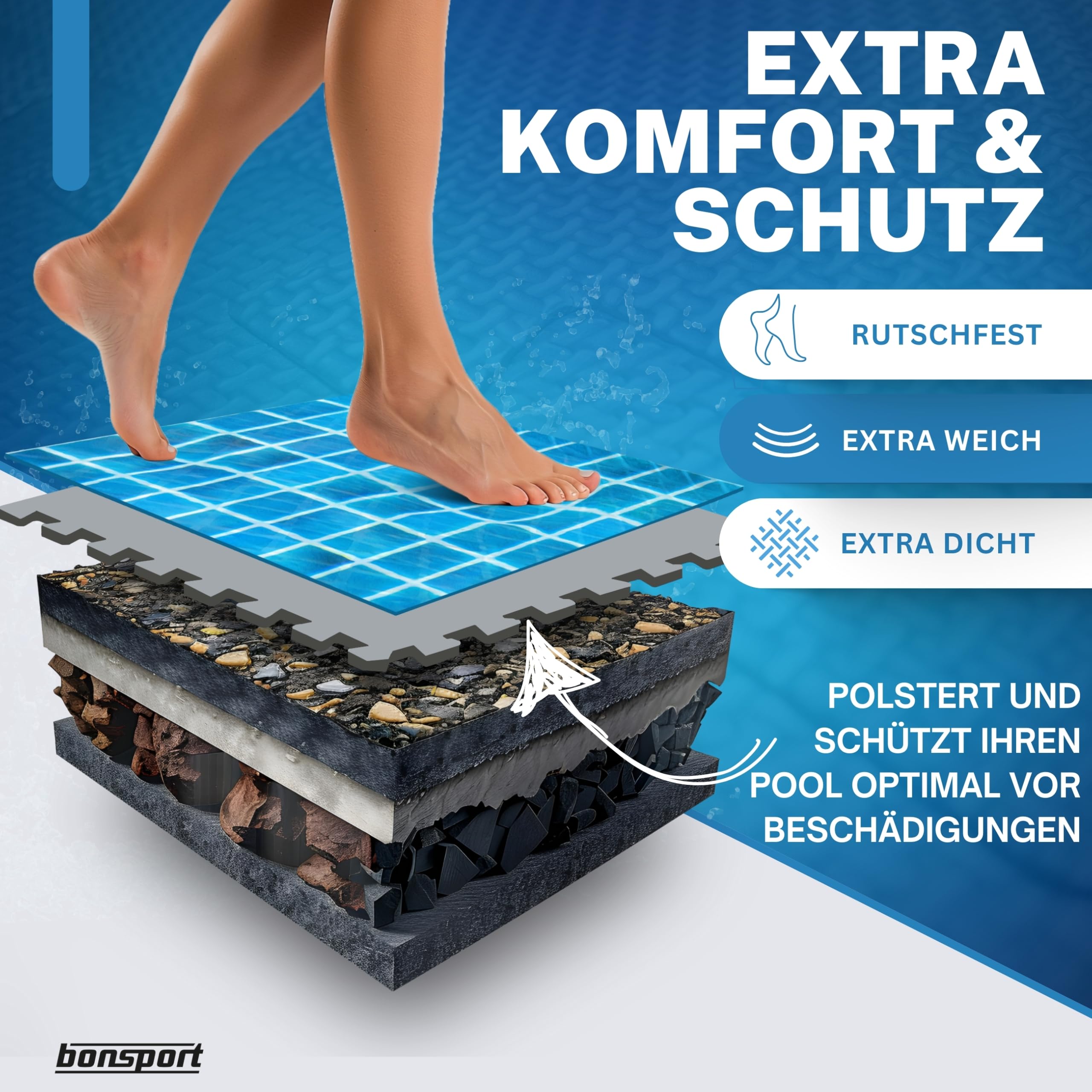 Damit dein Pool-Spaß nicht von spitzen Steinen oder unebenen Böden getrübt wird: Diese robuste Poolunterlage im Durchmesser von 366 cm schafft Abhilfe! Aus strapazierfähigem Polyester-Vliesstoff gefertigt, ist sie nicht nur durchstichsicher, sondern auch rutschfest - so hast du sicheren Halt beim Ein- und Aussteigen. Das coole Feature: Sie leitet die Wärme nicht weiter, sodass der Poolboden auch bei praller Sonne angenehm kühl bleibt. Die Installation ist super einfach - eine Person schafft das problemlos, ohne dass du dich mit Sand oder Schmutz rumärgern musst. Die Unterlage passt sich dank spezieller Zuschnitte auch unregelmäßigen Poolformen an und schützt so die empfindlichen Ränder. Egal ob auf Rasen, Holz oder Beton - sie gleicht Unebenheiten aus und sorgt für eine perfekt ebene Fläche. Die mehrlagige Verbundstruktur macht sie besonders stoßfest und langlebig. So machst du deinen Pool nicht nur sicherer, sondern verlängerst auch noch seine Lebensdauer - eine Win-Win-Situation für alle Pool-Besitzer!