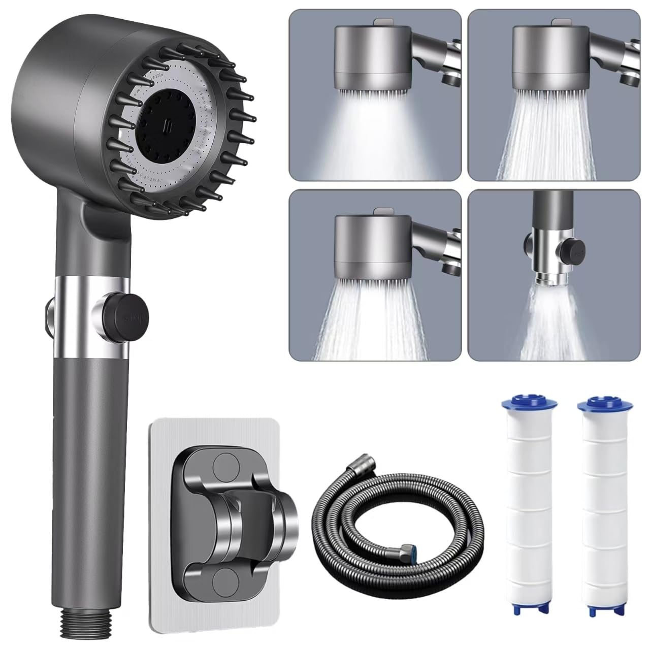 Duschen wie im Spa! Dieser Duschkopf mit eingebautem Filter macht nicht nur das Wasser weicher, sondern entfernt auch Rost und unangenehme Gerüche. Deine Haut und Haare werden's dir danken! Mit der praktischen Stopp-Taste kannst du das Wasser einfach anhalten während du eincremst oder shampoonierst - super wassersparend! Vier Strahlarten stehen zur Auswahl: Sanfter Regen, belebende Massage, Power Jet für eine intensive Reinigung oder der Mix-Modus für Abwechslung. Der große Duschkopf (aus robustem ABS-Material) bedeckt eine große Fläche und die Silikon-Düsen sind super easy zu reinieren. Einfach den alten Duschkopf abschrauben und diesen anschließen - Werkzeug brauchst du keines! Im Lieferumfang ist ein 1,5m knicksicherer Schlauch und eine Halterung dabei. Genieße ein regenwaldähnliches Dusch-Erlebnis jeden Tag - deine tägliche Dusche wird zum absoluten Wellness-Highlight! Einfach umsteigen und den Unterschied spüren!