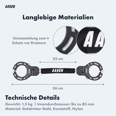 Dein E-Scooter oder Fahrrad bleibt sicher! Dieses coole Handschellenschloss von AARON hat eine massive Stahlkette und doppelte Bügel - echt schwer zu knacken. Wählbar zwischen 74mm oder 85mm Durchmesser - passt an fast jedes Fahrzeug. Die 1,5kg schwere Kette ist in alle Richtungen drehbar - super flexibel beim Anschließen. Mit kratzfester Ummantelung - Dein Scooter bleibt makellos. Drei Wendeschlüssel dabei - beidseitig verwendbar. Einfach zu handhaben - schnelles Abschließen und Losgehen. Die Panzergliederkette bietet maximalen Schutz gegen Diebe. Perfekt für Stadt, Bahnhof oder Einkaufszentrum. Macht Dieben das Leben schwer - und Dir das Leben leicht! Einfach um Laterne oder Fahrradständer schlingen - fertig. Das peace of mind für Dein teures Gefährt!