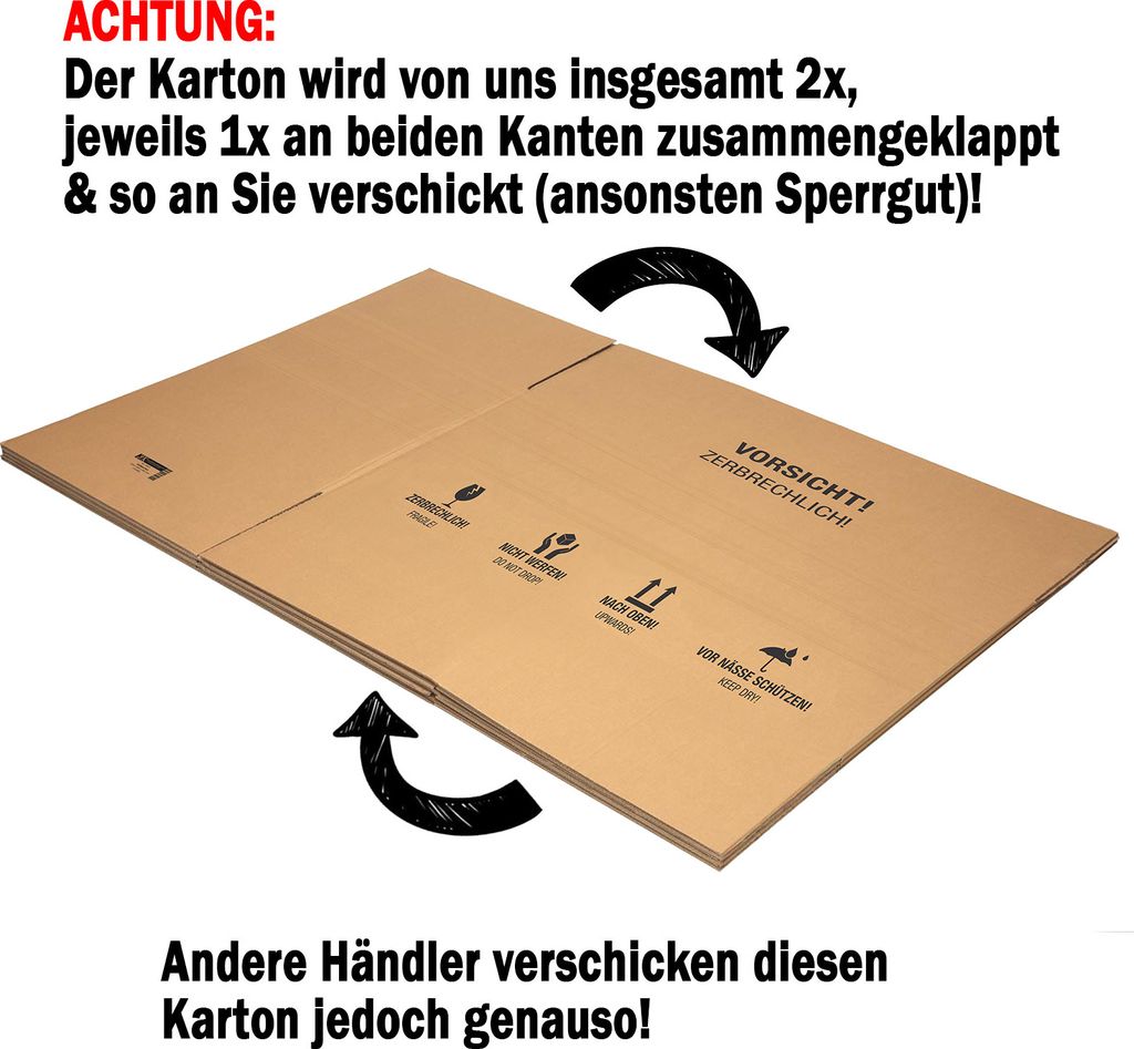 Dieser massive Versandkarton ist die perfekte Lösung für große und sperrige Sendungen! Mit den Außenmaßen 1200x600x600mm entspricht er genau der maximalen DHL-Paketgröße. Aus stabiler 2-welliger EB-Wellpappe gefertigt, hält er bis zu 25kg aus und schützt deine Ware optimal während des Transports. Die praktischen Höhenriller bei 200mm und 400mm ermöglichen es dir, den Karton bei Bedarf zu verkürzen. Nach Fefco 0201 gefertigt, lässt er sich einfach aufbauen und mit Klebeband verschließen. Ideal für Möbel, Maschinen, Elektrogeräte oder andere große Gegenstände. Wird platzsparend gefaltet geliefert. Ob für geschäftliche Versande oder private Umzüge - dieser Karton ist ein echter Allrounder!