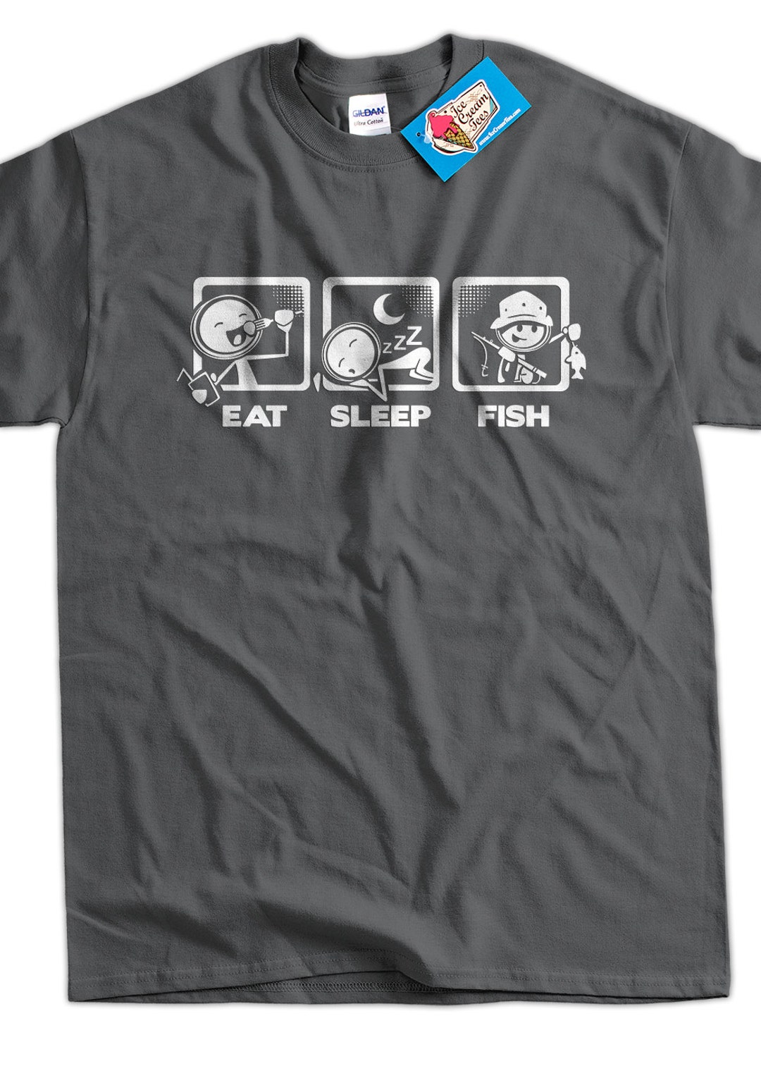 Hey Angler-Fans! Dieses coole T-Shirt mit dem Motto 'Eat Sleep Fish' spricht aus, was wir alle denken. Perfekt für alle, die das Angeln lieben - ob am See, Fluss oder Meer. Das Shirt ist aus hochwertiger 8.5 oz Baumwolle gefertigt und hat einen klassischen Schnitt. Der doppelt genähte Saum garantiert Langlebigkeit, auch bei häufigem Tragen. Ein ideales Geschenk für deine Angel-Freunde oder natürlich für dich selbst. Egal ob beim Angeln, beim gemütlichen Beisammensein oder unterwegs - mit diesem Shirt zeigst du deine Leidenschaft für den Angelsport. Die Druckqualität ist erstklassig und wascht sich nicht aus. So macht Angeln noch mehr Spaß!