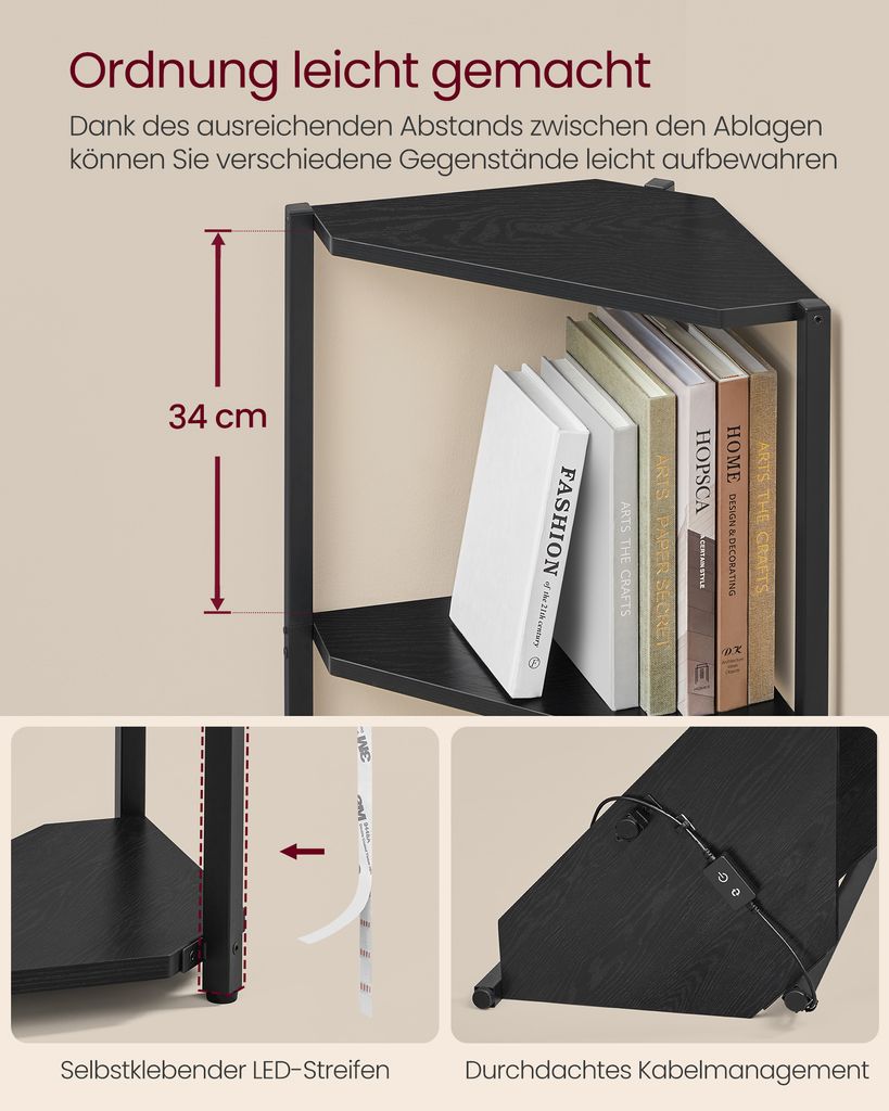 Endlich mal was für diese blöden Ecken! Dieses coole Dreieckregal mit 5 Etagen macht aus toten Ecken richtig stylische Highlights. Die integrierte LED-Beleuchtung lässt deine Bücher, Pflanzen und Deko-Stücke einfach strahlen - total gemütliche Atmosphäre garantiert! Super stabil steht das Teil, auch wenn's voll beladen ist. Aus kratzfester Spanplatte - hält was aus und ist easy zu reinigen. Perfekt für Wohnzimmer, Schlafzimmer, Büro oder sogar Bad. Der Aufbau ist werkzeuglos und in 30 Minuten erledigt. Kein Bohren, kein Stress - einfach zusammenstecken und fertig! Sieht aus wie von einem teuren Designer, kostet aber nur einen Bruchteil. Macht jeden Raum sofort gemütlicher und organisierter. Absolute Empfehlung für alle, die cleveren Stauraum lieben!
