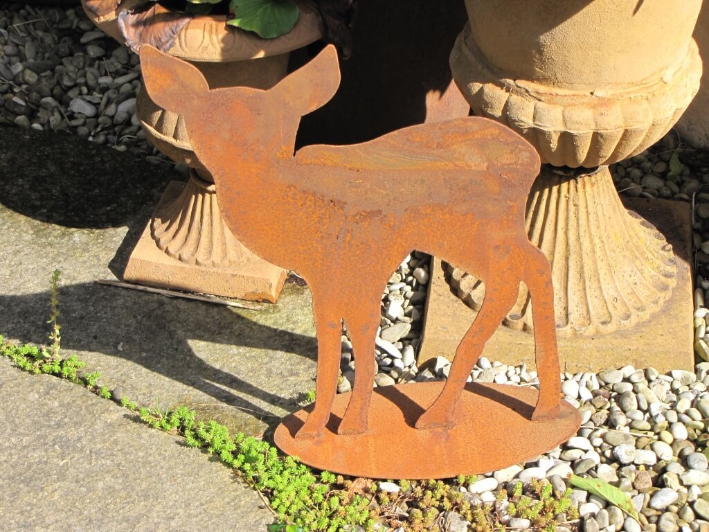 Verleihe deinem Garten einen Hauch von Waldromantik! Diese niedliche Kitz-Figur aus Edelrost von Albert Hechinger bringt Natur-Charme in deine Grünanlage. Mit 54 cm Höhe und 50 cm Breite ist das stehende Reh ein echter Blickfang. Der im Lieferumfang enthaltene Erdspieß (50 cm lang) sorgt für sicheren Halt im Boden. Hergestellt in Deutschland in eigener Werkstatt - da weißt du, was du bekommst! Der Edelrost verleiht der Figur eine wunderschöne, rustikale Optik, die mit der Zeit noch charmanter wird. Perfekt für Beete, Rasenflächen oder als Begrüßung am Garteneingang. Kombinierbar mit anderen Waldtieren aus der Serie für ein stimmiges Gesamtbild. Wetterbeständig und pflegeleicht - einfach in die Erde stecken und Jahre lang Freude haben. Ein ideales Geschenk für Gartenliebhaber und alle, die die Natur lieben!