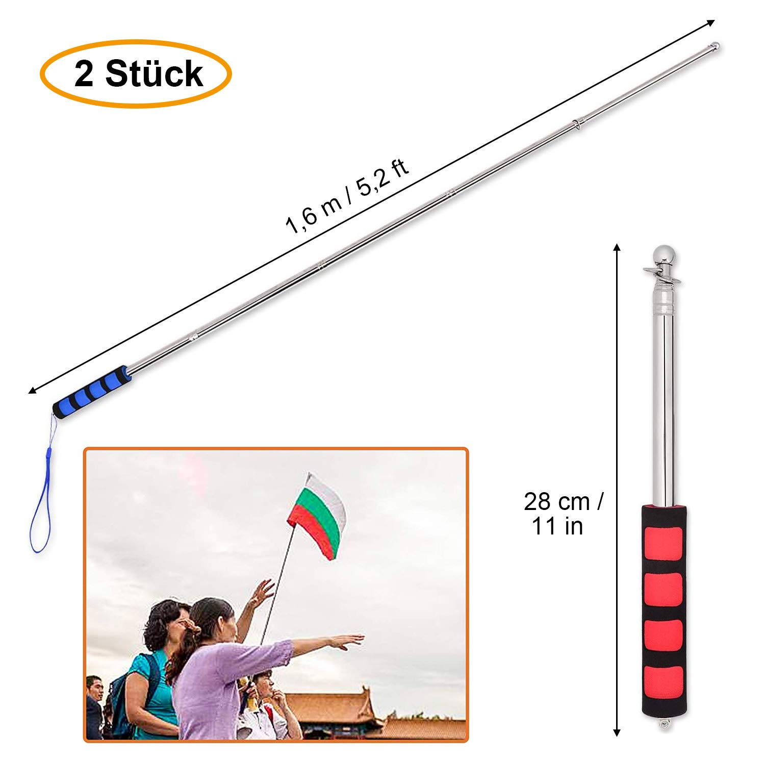 Ob für deine Reisegruppe, beim Camping, auf Demonstrationen oder im Unterricht - diese Fahnenmasten machen überall eine gute Figur. Die Qualität stimmt, und du kriegst gleich zwei Stück! Kleiner Hinweis: Wie immer kann's bei der Farbdarstellung auf dem Bildschirm leichte Abweichungen geben, und bei Handmessung vielleicht 1-2 mm Toleranz - aber das ist ja normal. Einfach auspacken, ausziehen und die Flagge hissen!