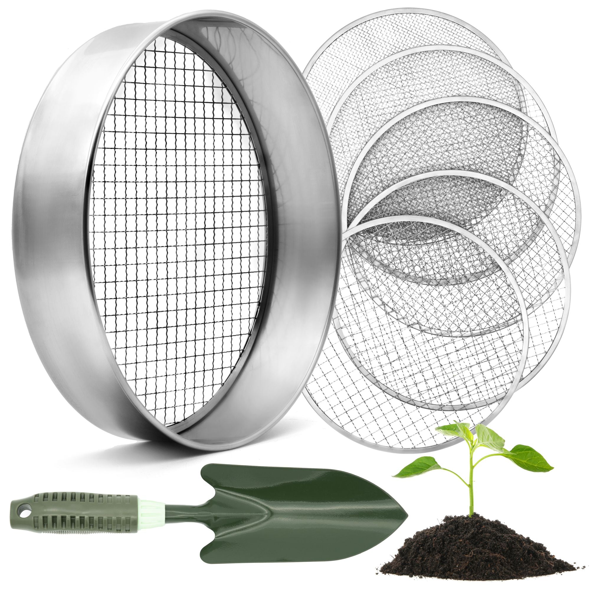 Dieses Gartensieb macht Boden-Sieben zum Kinderspiel! Mit 30,5cm Durchmesser und 5 verschiedenen Siebeinsätzen (3, 6, 9, 10, 12mm) bist du für jede Aufgabe gewappnet. Ob feine Erde für die Anzucht, Kompost sieben oder Steine entfernen - hier findest du das passende Sieb. Aus robustem Edelstahl gefertigt, rostfrei und super langlebig. Die Siebeinsätze lassen sich ganz einfach wechseln und sind stabil im Rahmen eingespannt. Im Set inklusive praktischer Schaufel mit 27cm Länge. Perfekt um deine Gartenerde zu verbessern und deine Pflanzen optimal wachsen zu lassen. Ein Muss für jeden Hobby-Gärtner!