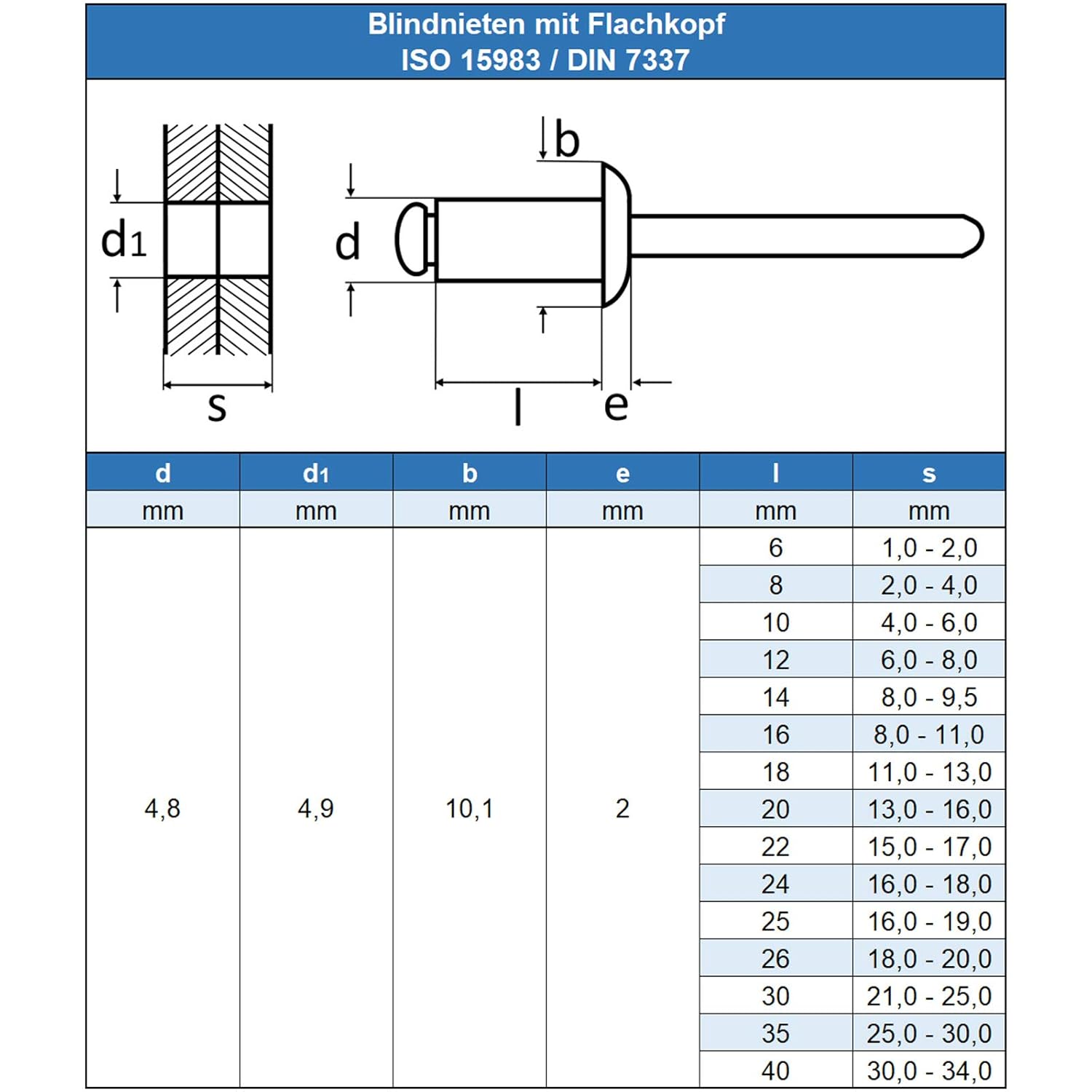 Profis und Heimwerker lieben diese Blindnieten! Aus rostfreiem Edelstahl A2 gefertigt - perfekt für feste Verbindungen von Blechen und Metallteilen, auch wenn nur eine Seite zugänglich ist. Größe: 4,8x40mm mit Flachkopf nach DIN 7337. Einfach mit einer Blindnietzange montieren - der Dorn reißt an der Sollbruchstelle ab und hinterlässt eine stabile Verbindung. Ideal für Auto-, Maschinen- und Schiffsbau oder einfach für deine DIY-Projekte. Im Lieferumfang sind 20 Stück enthalten - genug für mehrere Projekte! Einfach Loch vorbereiten, Niet einsetzen und festziehen - schon hält's für die Ewigkeit!