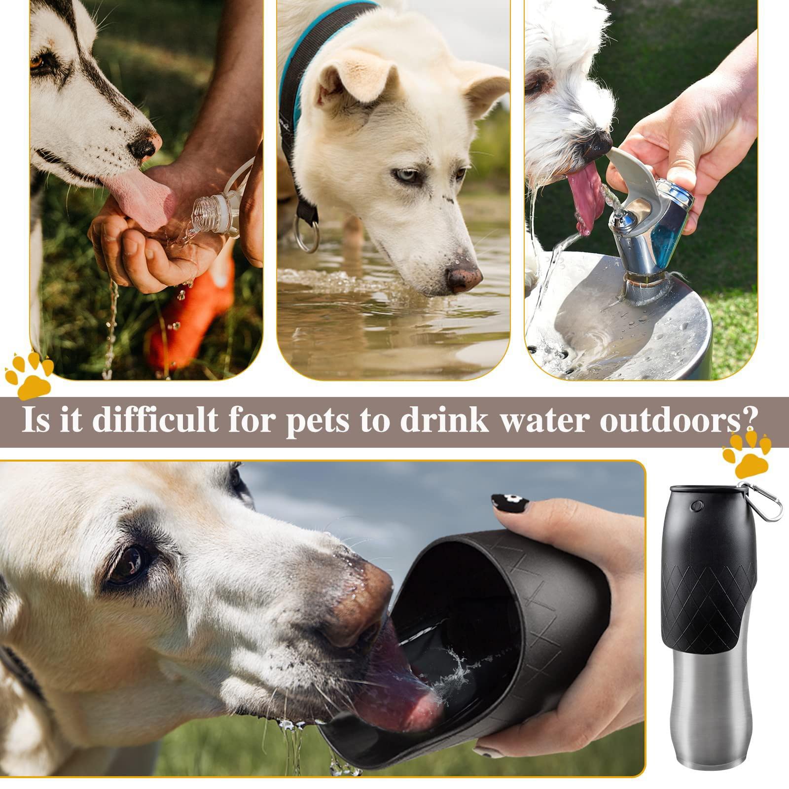 Hallo Herrchen und Frauchen! Euer Hund soll immer frisches Wasser haben? Diese Edelstahl-Trinkflasche ist die Lösung! Mit 600ml Fassungsvermögen ist genug für große Hunde und lange Spaziergänge dabei. \\n\\nSuper praktisch: Die Flasche hat einen integrierten Napf als Deckel - einfach Knopf drücken und schon kann dein Liebling trinken! Kein langes Suchen nach einem Wassernapf mehr. \\n\\nUnd das Beste: Alles ist aus lebensmittelechtem Edelstahl, komplett auslaufsicher und mit Karabiner zum Befestigen am Rucksack. Passt sogar in die meisten Auto-Becherhalter! \\n\\nDein Hund trinkt unterwegs oft aus Pfützen? Damit gehört das der Vergangenheit an - Magen-Darm-Probleme adé! Besonders praktisch beim Wandern, im Hundepark oder auf Reisen. \\n\\nDie weite Schale macht's auch größeren Hunden leicht, bequem zu trinken. Und du hast die Hände frei, um mit deinem Vierbeiner zu spielen. Ein Must-Have für jeden aktiven Hundebesitzer! Euer Hund wird's euch danken - versprochen!