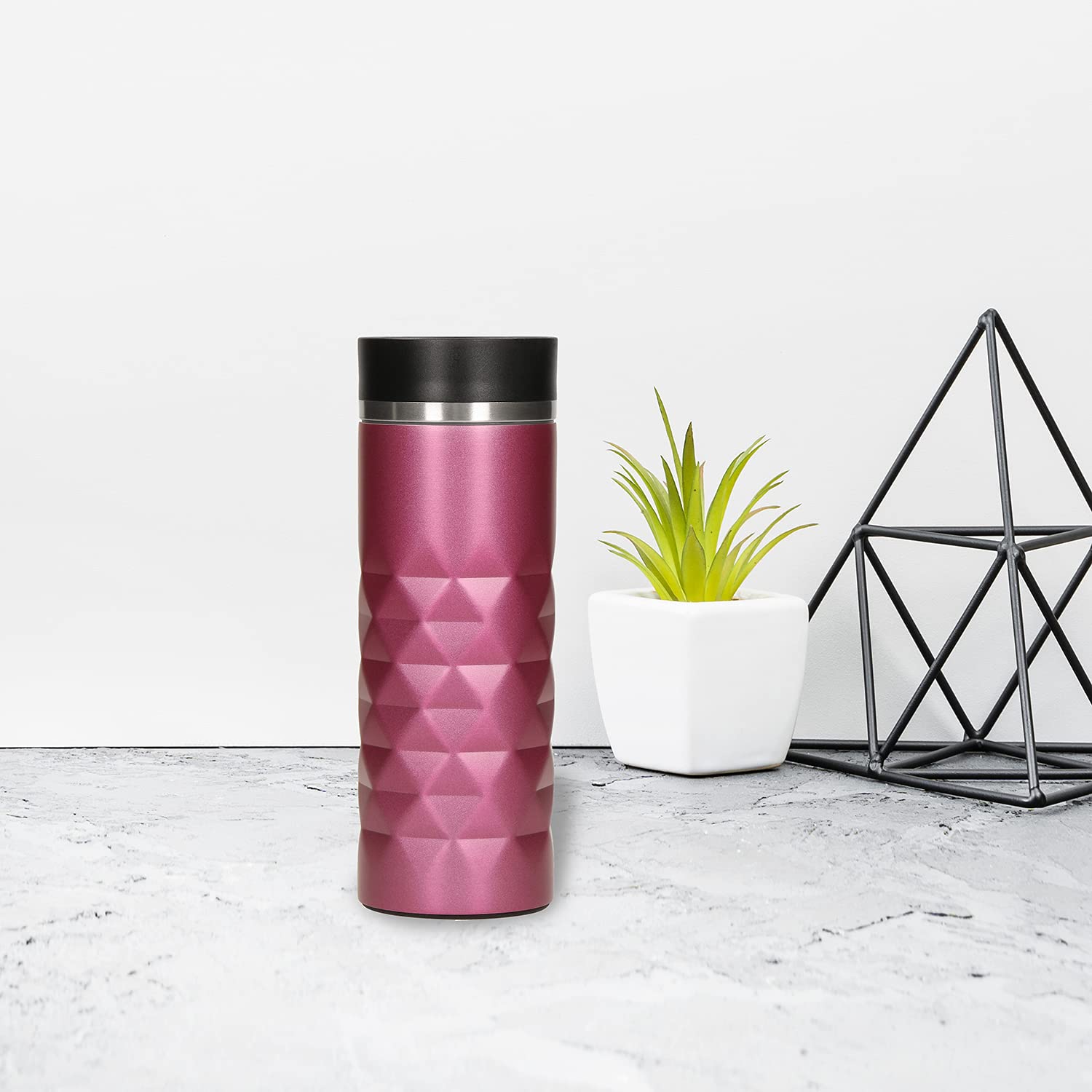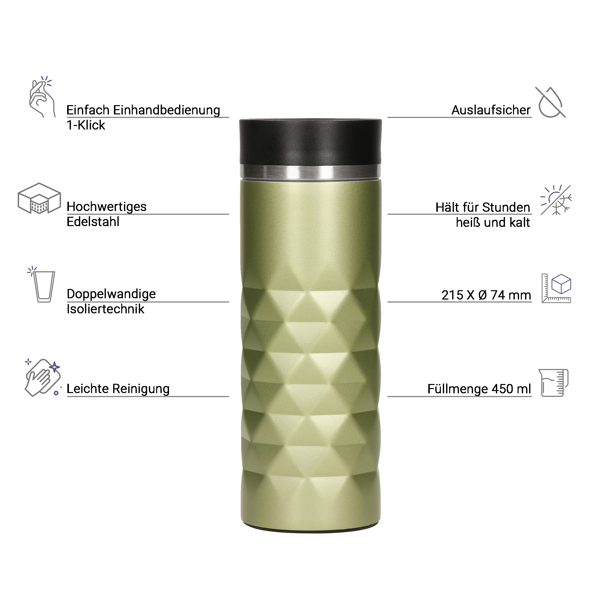Alter, dieser Thermobecher ist ja mal richtig durchdacht! Mit 450 ml Fassungsvermögen passt genau die richtige Menge Kaffee oder Tee rein. Aus doppelwandigem Edelstahl hält er deine Getränke stundenlang heiß - oder im Sommer eiskalt!\\n\\nDas Diamond-Design sieht nicht nur stylisch aus, sondern gibt auch super Halt. Und der gummiierte Boden verhindert lästiges Rutschen auf glatten Oberflächen. Perfekt fürs Auto, Büro oder unterwegs.\\n\\nDer auslaufsichere Push-Deckel ist der absolute Hit! Keine Tropfen mehr in der Tasche oder auf der Kleidung. Einfach aufdrücken und trinken - praktischer geht's kaum.\\n\\nUnd die Reinigung ist super einfach: Der Deckel lässt sich komplett zerlegen, sodass du auch in die Ecken kommst. Geschmacks- und geruchsneutral bleibt dein Getränk immer frisch, ohne komische Beigeschmäcke.\\n\\nEgal ob du pendelst, im Büro sitzt oder einfach nur gemütlich zu Hause bist - dieser Becher ist dein perfekter Begleiter. In schwarz sieht er dazu noch richtig edel aus. Qualität, die man merkt!