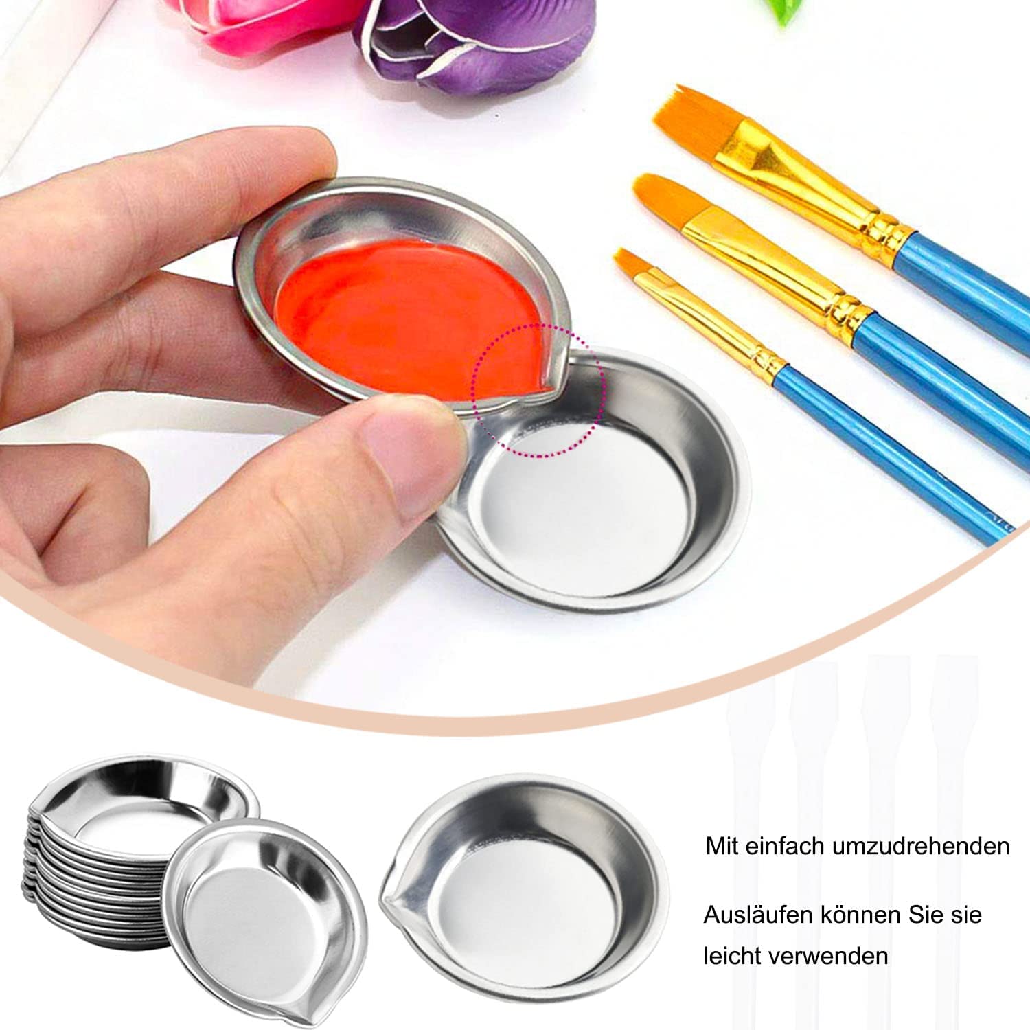 Hey du kreative Seele! Stell dir vor, du hast diese superpraktischen Edelstahl-Farbschalen, mit denen das Mischen von Farben total easy wird. Jede dieser runden Schalen hat nämlich eine praktische Gusslippe - da läuft nix daneben! Mit nur 5cm Durchmesser sind sie superkompakt und passen in jede Tasche. Ob du jetzt Aquarelle malst, Make-up mischst oder mit Nagellack experimentierst - diese Schalen aus rostfreiem Stahl machen einfach alles mit. Und das Beste: Die Reinigung ist ein Klacks! Einfach mit Wasser abspülen, trocknen lassen und fertig. Das 12er-Set gibt dir genug Platz für alle deine Farben und Projekte. Perfekt für unterwegs, im Atelier oder für spontane kreative Sessions zu Hause. Die hochwertige Edelstahl-Qualität hält echt ewig und korrodiert nicht - selbst nach jahrelanger Nutzung sehen die Dinger noch aus wie neu. Mach dir keine Sorgen um Pigmente oder Lösungsmittel, dem Material macht das nichts aus. Ob Profi-Künstler, Hobby-Maler oder Make-up-Lover - mit diesen Schalen wird jedes Projekt zum Erfolg!