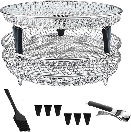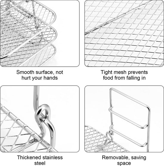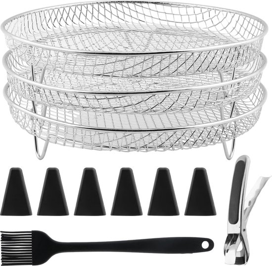 Mensch, diese Airfryer Roste sind ein Game-Changer für deine Heißluftfritteuse! Das Set besteht aus drei stapelbaren Rosten aus Edelstahl 304 - also lebensmittelecht und super einfach zu reinigen. Perfekt für Fritteusen zwischen 4.2 und 5.8QT wie Philips, Ninja oder Cosori. Was bringt's? Du kannst jetzt mehrere Dinge gleichzeitig garen - unten die Pommes, oben das Gemüse und in der Mitte die Hähnchenflügel! Die Roste haben spezielle Luftlöcher für optimale Heißluft-Zirkulation - alles wird gleichmäßig knusprig. Und weil sie stapelbar sind, brauchst du kaum Stauraum. Super praktisch zum Dörren von Obst, Grillen von Fleisch oder einfach nur um mehr Platz in der Fritteuse zu haben. Die Roste sind stabil, verformen sich nicht und sind spülmaschinengeeignet. Kein lästiges Schichtweise-Garen mehr - einfach alles auf einmal rein und fertig! Besonders gut für Familien oder wenn du Meal-Prep betreibst. Einfach in den Korb legen, beladen und genießen! Damit wird deine Heißluftfritteuse noch vielseitiger und du sparst Zeit und Energie. Einfach bestellen und loskochen!