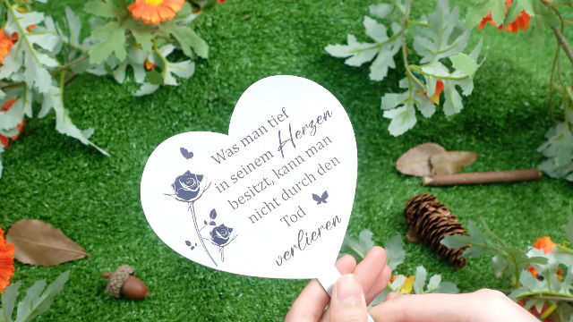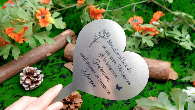 Dieser wunderschöne Grabschmuck in Herzform aus Edelstahl ist eine berührende Art, an geliebte Menschen zu erinnern. Mit dem Spruch 'Menschen, die wir lieben, bleiben für immer in unseren Herzen' drückt er genau das aus, was oft schwer in Worte zu fassen ist. Die wetterfeste Ausführung aus hochwertigem Edelstahl sorgt dafür, dass der Grabstecker auch bei Regen, Schnee und Sonne lange Zeit schön bleibt - kein Rost, kein Verblassen. Mit den Maßen 28x12 cm und 1,5 mm Stärke ist er auffällig genug, um Aufmerksamkeit zu erregen, aber nicht zu aufdringlich. Perfekt für Gräber, Gedenkgärten oder auch im eigenen Garten als stille Erinnerung. Das Herz-Symbol steht für die ewige Liebe und Verbundenheit, die über den Tod hinausreicht. Ein tröstliches Andenken, das zeigt, dass die Erinnerungen an geliebte Menschen immer weiterleben. Einfach im Erdreich befestigen und so eine bleibende Hommage an verstorbene Angehörige schaffen. Ein Geschenk, das von Herzen kommt und Trost spendet.