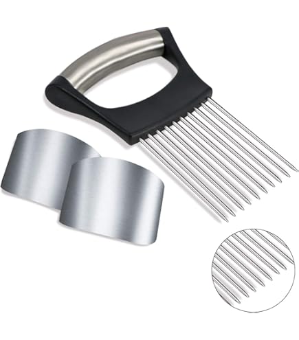 Nie wieder Tränen beim Zwiebelschneiden! Dieser Halter aus Edelstahl und ABS hält Zwiebeln, Tomaten und mehr sicher fest. 16 scharfe Zinken - schneidet perfekt ohne zu verrutschen. Rutschfeste Unterseite - steht stabil auf der Arbeitsfläche. Auch für Zitronen, Kartoffeln oder als Fleischklopfer geeignet. Einfach Gemüse aufspießen, mit Messer entlang der Zinken schneiden - fertig! Leicht zu reinigen, spart Zeit und Nerven. Damit wird Kochen zum Vergnügen statt zum Kampf mit dem Gemüse!