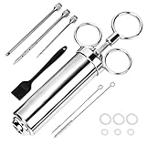 Perfekt für saftiges Grillfleisch! Diese Edelstahl-Marinadespritze mit 60 ml Fassungsvermögen und zwei 14,5 cm langen Nadeln macht jedes Fleischstück zart und aromatisch. Einfach die Marinade aufziehen, ins Fleisch injizieren und schon dringt das Aroma tief ein. Besonders gut für zähe Fleischstücke wie Rinderbrust, aber auch für Hühnchen, Pute, Lamm und Fisch. Aus lebensmittelechtem Edelstahl, auslaufsicher und einfach zu reinigen. Der abnehmbare Deckel macht das Befüllen zum Kinderspiel. Mit Ersatzdichtungen für langen Gebrauch. Ein Muss für jeden Grill-Profi!