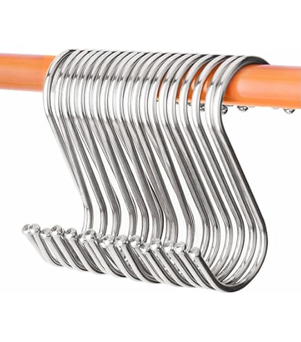 Endlich Ordnung in Küche, Bad & Co.! Mit diesen 50 robusten S-Haken aus Edelstahl schaffst du im Handumdrehen Stauraum für Töpfe, Handtücher, Gartengeräte und mehr. Jeder Haken ist 10 cm lang und 5 mm dick – damit hält er auch schwerere Gegenstände sicher aus. Und keine Sorge vor Rost: Der Edelstahl ist langlebig und pflegeleicht.