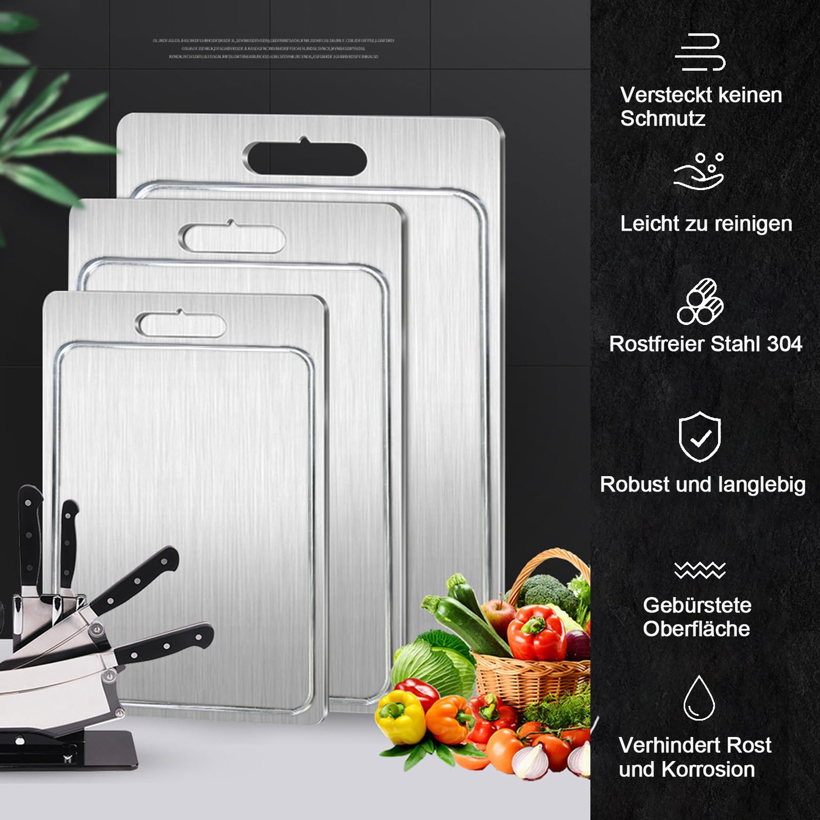 Schluss mit holzigen Schneidebrettern, die alles vollsaugen! Dieses 3-teilige Edelstahl-Schneidebrett-Set ist der absolute Game-Changer in deiner Küche. Aus lebensmittelechtem Edelstahl und nur 1 mm dick, sind die Bretter superleicht und supereinfach zu reinigen. Einfach abspülen - schon sind sie wieder trocken und bereit für den nächsten Einsatz! Die drei Größen (39x28 cm, 34x23 cm, 25x15 cm) sind perfekt aufgeteilt: Das große für Gemüse, das mittlere für Obst und das kleine für Knoblauch oder Zwiebeln. Besonders clever: Beide Seiten sind nutzbar! So kannst du eine Seite für rohes Fleisch und die andere für gekochte Lebensmittel verwenden - keine Kreuzkontamination mehr! Und weil's aus Metall ist, nimmt es keine Gerüche an und wird nicht wellig wie Holz. Sieht auch noch mega-modern aus in deiner Küche! Einfach mal ausprobieren - du wirst deine alten Schneidebretter nicht mehr vermissen!