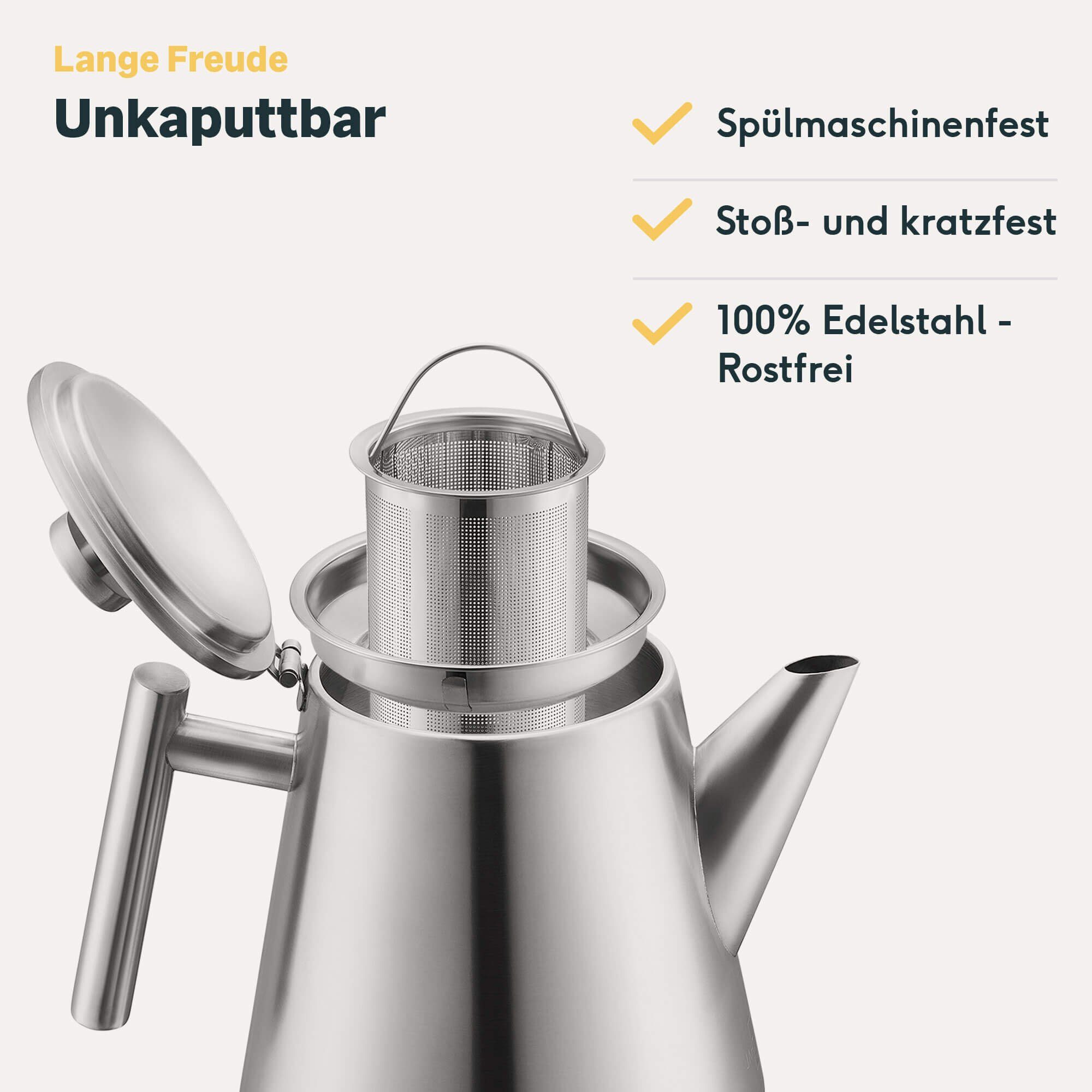 Tee-Liebhaber aufgepasst! Diese Edelstahl-Teekanne von Harupink ist ein echter Allrounder. Mit 2 Litern Fassungsvermögen ideal für 3-6 Personen - perfekt für die Familie oder wenn Besuch kommt. Der energiesparende Boden heizt Wasser gleichmäßig und schnell auf, spart Zeit und Energie. Kompatibel mit allen Herdarten: Induktion, Gas, Halogen, Ceran - einfach universell einsetzbar. Mit praktischem herausnehmbarem Teesieb - da bleiben keine Blätter im Tee. Der lange Ausguss mit Belüftungsloch gießt tropffrei aus - keine Sauerei auf dem Tisch! Der ergonomische Griff ist heat-safe - keine verbrannten Finger. In silber oder gold erhältlich, 19,5cm hoch und richtig robust verarbeitet. Ob morgens zum Wachwerden oder nachmittags zur Entspannung - mit dieser Kanne wird Teetrinken zum Erlebnis!