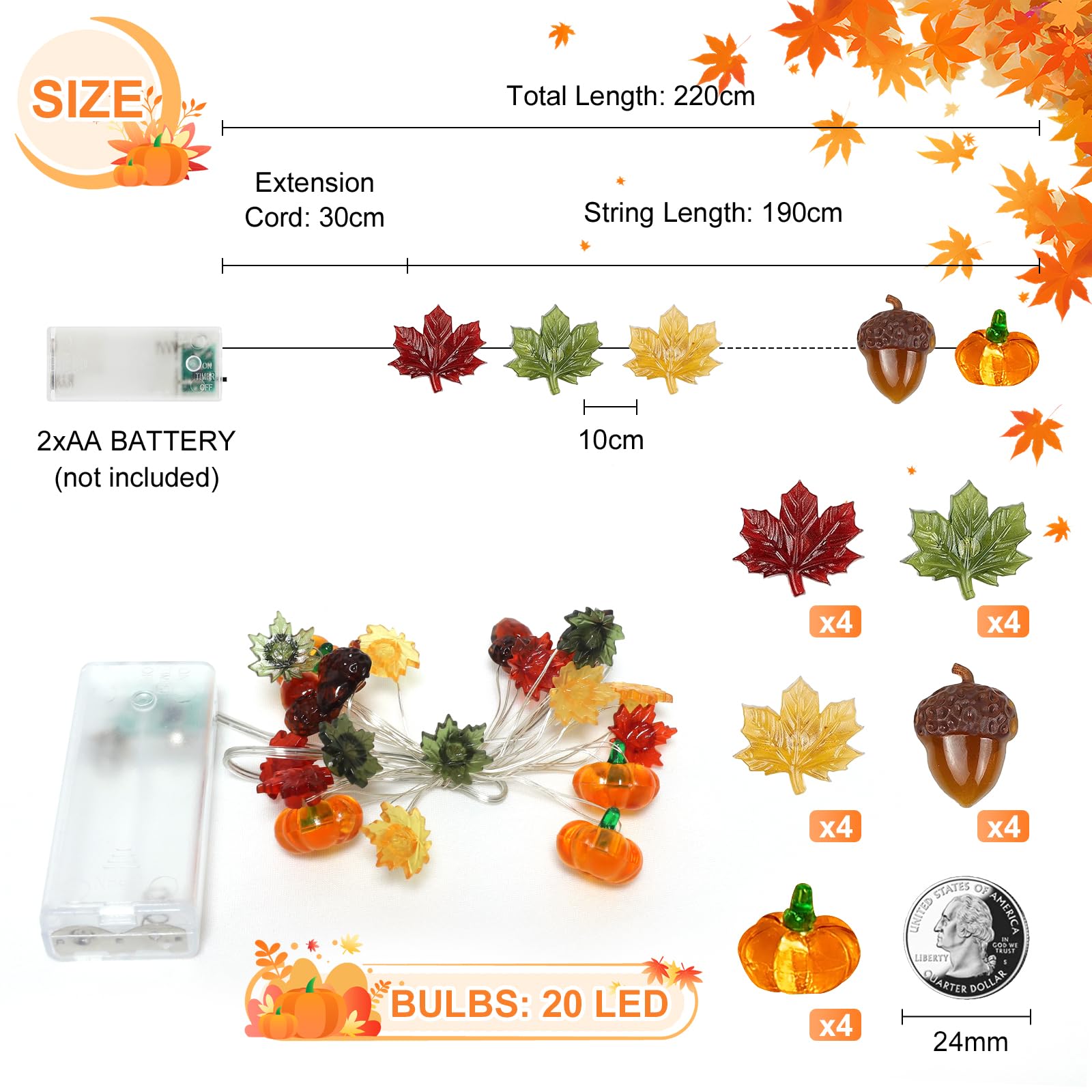 Coole Herbst-Deko: Diese Eichel-Lichterkette mit 20 LED-Lichtern auf 2 Metern Länge bringt gemütliche Stimmung in dein Zuhause! Batteriebetrieben (2x AA, nicht im Lieferumfang) - super flexibel und ohne Kabelwirrwarr. Wasserdichtes Kabel, aber Achtung: Das Batteriefach mag kein Wasser. Der weiche Kupferdraht lässt sich leicht in Form biegen. Perfekt für Drinnen und Draußen - ob im Wohnzimmer, Garten oder auf der Feier. Schafft eine warme Atmosphäre an trüben Tagen. Ideal für Herbst-Partys, Halloween, Weihnachten oder Geburtstage. Einfach aufhängen und einschalten - schon leuchtet alles festlich! Auch als Geschenk eine tolle Idee. Mach deine Dekoration noch persönlicher! Einfach und effektvoll - so mag man das!