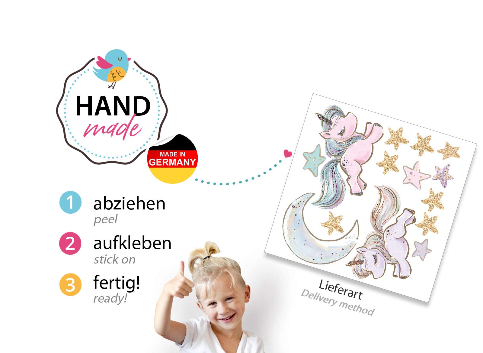 Verzaubere das Kinderzimmer! Dieser süße Little Deco Wandaufkleber mit Einhorn, Mond und Sternen in lila macht jedes Mädchenzimmer zum Märchenland. Auf einem A4 Bogen, einfach zu verarbeiten - konturgeschnitten für perfektes Ergebnis. Hält auf allen glatten Oberflächen, auch Raufaser! Und das Beste: Lässt sich rückstandslos wieder entfernen. Chlor- und weichmacherfrei - absolut kindersicher! Hergestellt in Deutschland mit viel Liebe zum Detail. Perfekt als Geschenk zur Geburt oder Geburtstag! Einfach aufkleben und in strahlende Kinderaugen schauen!