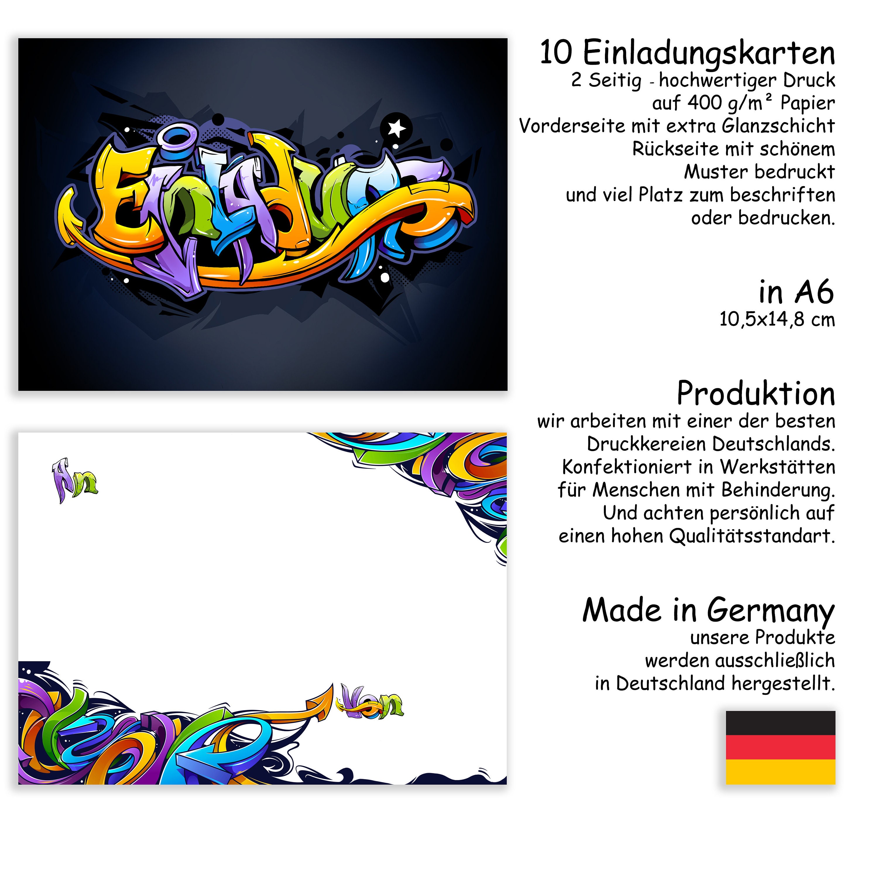 Hey, dein Kind wird 9? Dann ist dieses Einladungsset genau das Richtige! Im Pack sind 10 komplett ausgestattete Einladungen mit allem, was du für eine coole Geburtstagsparty brauchst. Die Karten im A6 Format (10,5x14,8cm) haben ein modernes Graffiti-Design, das sowohl Jungs als auch Mädchen lieben werden! Auf der Rückseite findest du vorgedruckte Felder zum Ausfüllen - da vergisst du bestimmt nichts Wichtiges. Aber das ist noch nicht alles: Dazu gibt's passende Umschläge, 10 Party-Tüten (14x22cm) für kleine Mitgebsel, 10 coole Aufkleber, 10 Lesezeichen und sogar 10 'Schiffe versenken'-Blöcke! Alles in Deutschland produziert und von top Qualität. Die Karten sind mit UV-Lack veredelt und wirken richtig hochwertig. So macht das Einladen zur Party gleich doppelt Spaß! Die Tüten kannst du mit Süßigkeiten oder kleinen Spielsachen füllen - die Gäste werden begeistert sein. Und 'Schiffe versenken' ist der perfekte Zeitvertreib für Wartezeiten während der Party. Es gibt das Set auch in anderen Stückzahlen - falls du mehr oder weniger Einladungen brauchst. Einfach bestellen, ausfüllen und die Vorfreude auf die Party steigern!