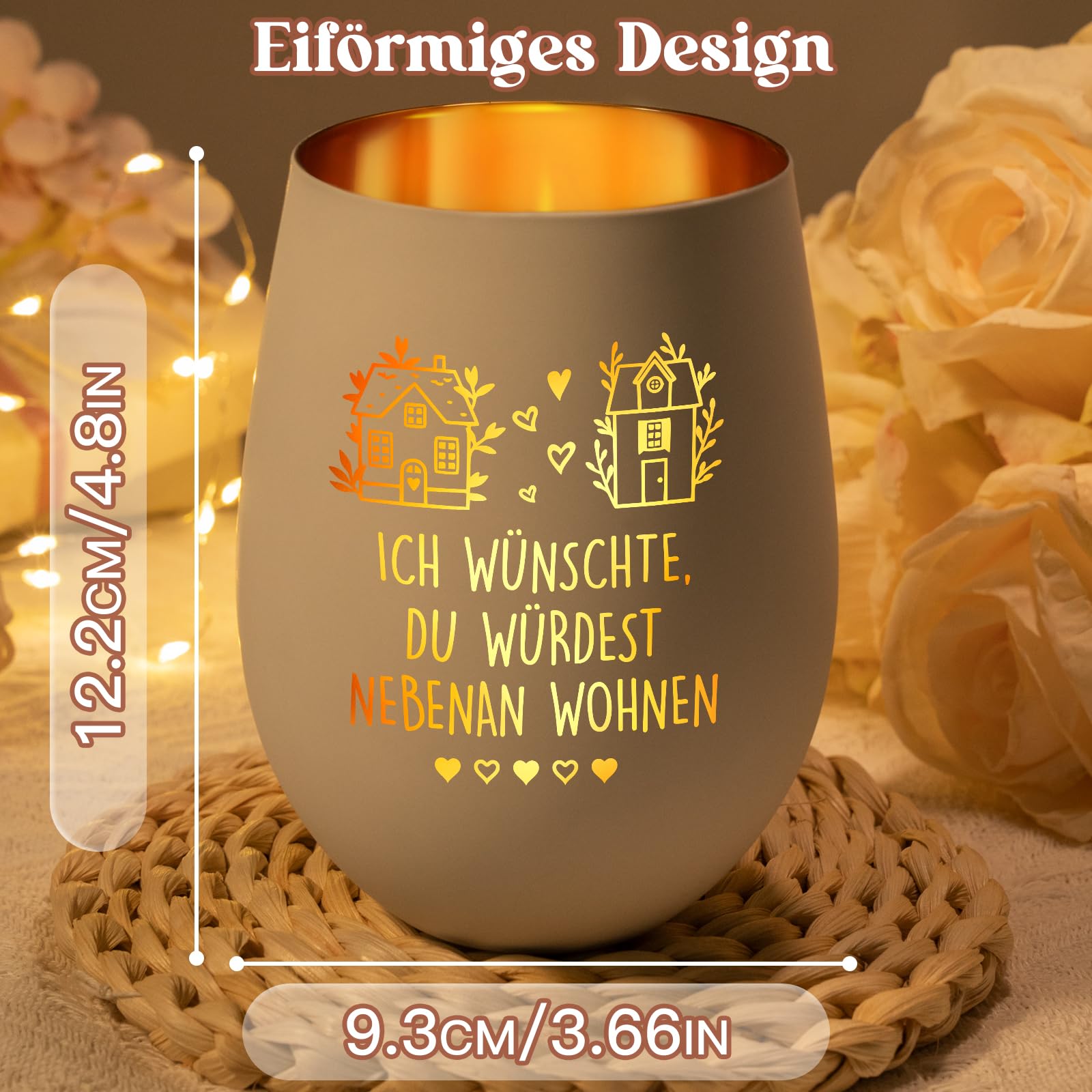 Suchst du ein besonderes Geschenk zum Einzug? Dieses Windlicht aus Glas mit der Gravur 'Ich wünschte, du würdest nebenan wohnen' ist perfekt! Mit 9,3x9,3x12,2cm ist es handlich und dekorativ. Die goldfarbene Innenseite lässt das Kerzenlicht warm leuchten - super gemütlich! Ob im Wohnzimmer, auf dem Tisch oder draußen - es schafft überall eine tolle Atmosphäre. Ein ideales Geschenk für Freunde, Familie oder Nachbarn, die neu eingezogen sind. (Kerzen separat erhältlich) Mach jemandem eine Freude und schenke dieses schöne Windlicht - es wird bestimmt begeistern!