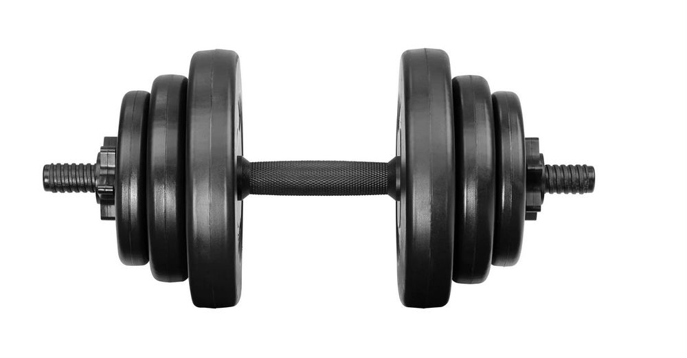 Im Lieferumfang ist alles dabei: 4x 1kg Scheiben, 4x 1,25kg Scheiben, 4x 2kg Scheiben, 2 Kurzhantelstangen, 4 Verschlüsse, 4 Endkappen und 1 Verbinder. Damit kannst du auch eine Langhantel zusammenbauen!