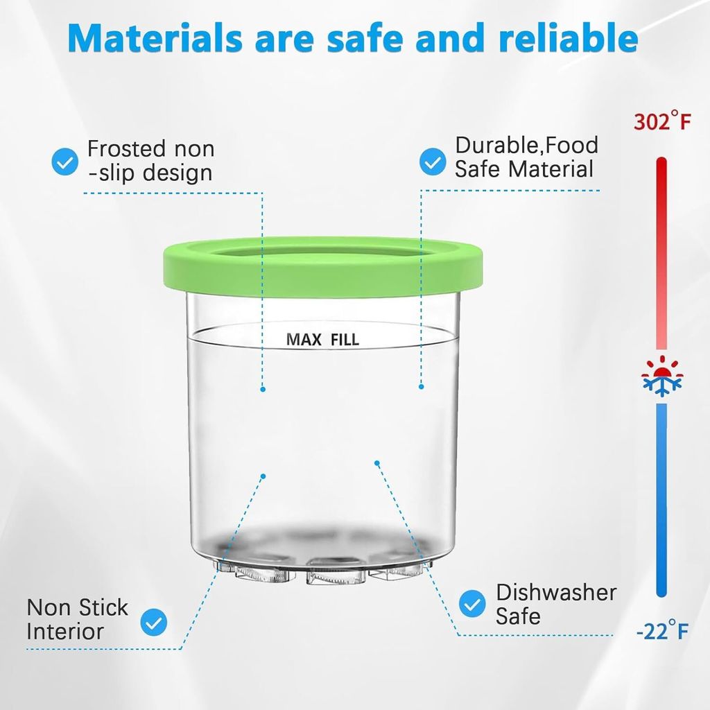 Wow, jetzt kannst du richtig viel Eis auf Vorrat machen! Dieses 4-teilige Set mit Eisbehältern passt perfekt zu deiner Ninja Eismaschine (NC301, NC300, NC299AMZ). Die Behälter sind super praktisch - mit luftdichtem Deckel, damit nichts ausläuft. Du kannst sie nicht nur für Eis verwenden, sondern auch für Sorbets, Milchshakes oder zur Aufbewahrung von Nüssen und Müsli. Die transparenten Behälter in Blau, Rosa, Lila und Grün zeigen dir immer sofort, was drin ist. Und das Beste: Spülmaschinenfest und hitzebeständig von -30°C bis 150°C! Also keine Angst vor Temperaturschocks. Die Maße von 13x12cm sind ideal für die Ninja-Maschinen. So macht Eiscreme selber machen noch mehr Spaß - und du hast immer genug Behälter für verschiedene Sorten parat!