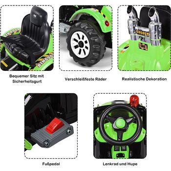 Oh Mann, was für ein cooles Teil! Dieser Elektro-Tractor mit Schaufel ist der absolute Hit für kleine Baustellen-Fans. Mit 12V-Batterie und 2 Motoren fährt der richtig gut - sowohl per Fernbedienung (2,4GHz mit 120m Reichweite!) als auch manuell mit Fußpedal und Lenkrad. Die Schaufel lässt sich heben und senken, genau wie bei den großen Baggers. Und sicher ist er auch: Verstellbarer Sicherheitsgurt, Notbremse per Fernbedienung und langsame Startfunktion. Tragkraft bis 50kg, also auch für etwas größere Kinder geeignet (3-8 Jahre). Mit LED-Leuchten, Hupe, Musik-Player und sogar USB-Anschluss. Geschwindigkeit von 3,2-5,1 km/h - schnell genug für Spaß, langsam genug für die Sicherheit. Ob Geburtstag, Weihnachten oder einfach so - damit machst du jedes Kind glücklich!