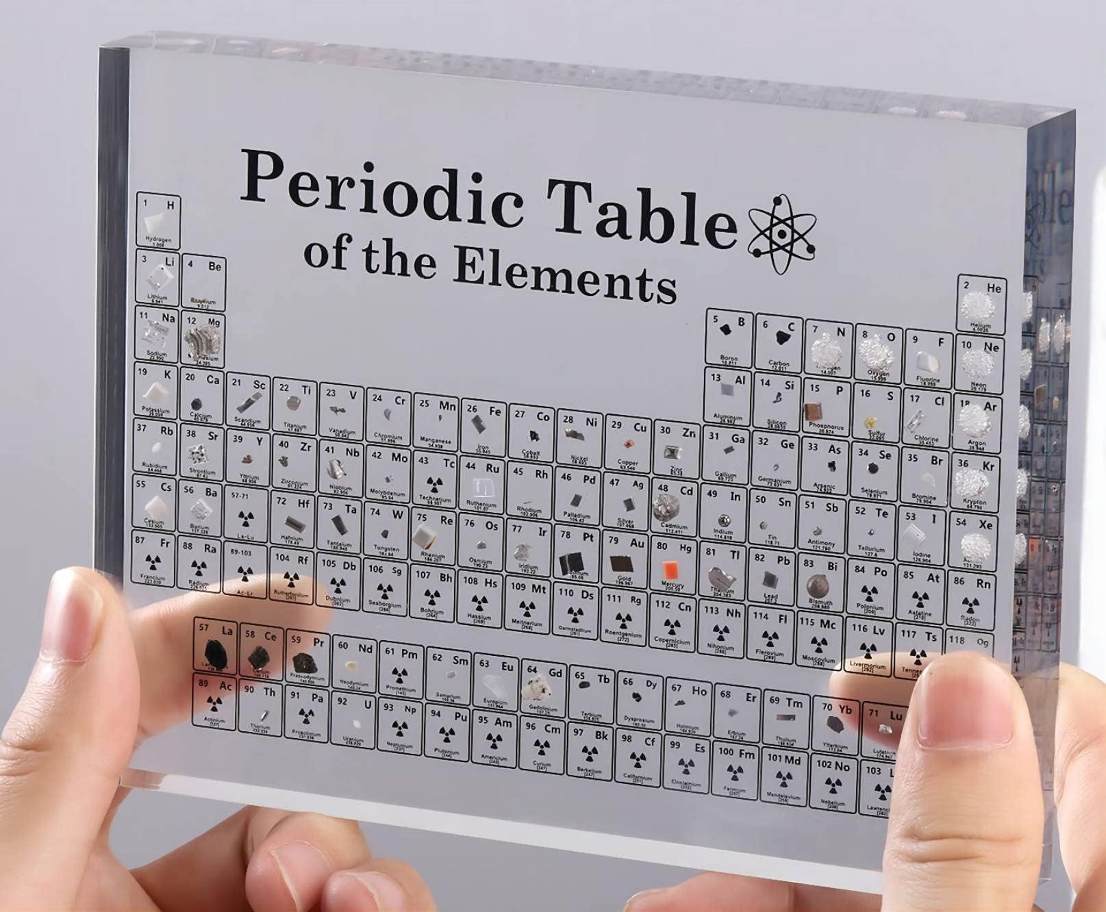 Chemie zum Anfassen! Dieses einzigartige Periodensystem enthält 83 echte Elementproben, die sicher in Acryl eingegossen sind. Die dreischichtige Acryl-Konstruktion ist stabil und durchscheinend - ideal um die Elemente optimal zu betrachten. Das achteckige Design ohne scharfe Kanten ist sicher in der Handhabung. Mit abnehmbarer Basis für flexiblen Einsatz. Perfekt für den Unterricht, als Deko fürs Home-Office oder Labor, oder als faszinierendes Geschenk für Chemie-Begeisterte, Studenten und Lehrer. Einige radioaktive und seltene Elemente sind aus Sicherheitsgründen nicht enthalten. Fördert das Interesse an Naturwissenschaften und macht Lernen zum Erlebnis. Wissenschaft, die begeistert!
