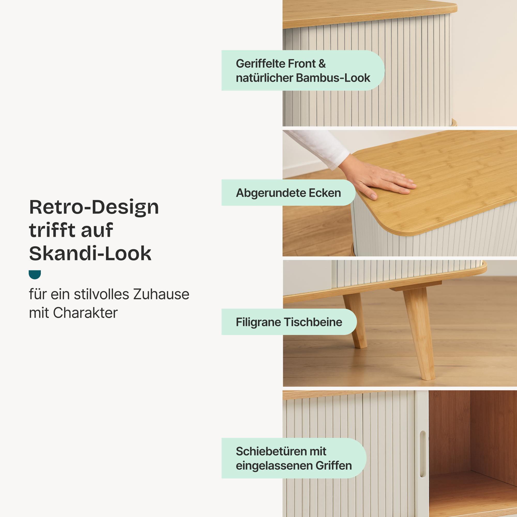 Stylisches TV-Lowboard das Ordnung ins Wohnzimmer bringt! Der Tysvær von en.casa aus Bambus und MDF bietet mit 120x40x58cm perfekte Maße für die meisten Flachbildfernseher. Zwei praktische Schiebetüren verstecken DVDs und Spiele, das offene Fach in der Mitte ist ideal für Receiver und Spielekonsole. Der Kabeldurchlass in der Rückwand sorgt für aufgeräumte Optik. In cremeweiß/natur passt es zu vielen Einrichtungsstilen. Einfacher Aufbau - schon kurz nach dem Auspacken steht dein neuer Fernsehtisch! Umweltfreundliches Bambus-Material das lange Freude bereitet.