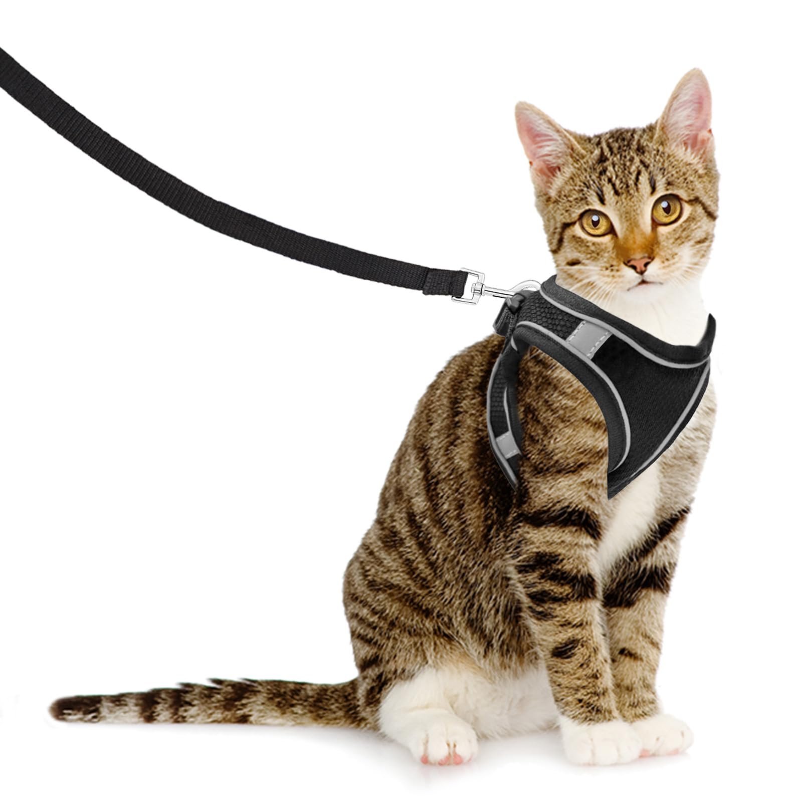 Deine Katze will raus? Mit diesem atmungsaktiven Geschirr geht's sicher nach draußen! Aus weichem Polyester-Netzmaterial, das super luftig ist und nicht auf der Haut klebt. Mit Klettverschluss und Schnallen total einfach an- und auszuziehen. Der 360-Grad drehbare Leinenring verhindert, dass sich die Leine verheddert. Reflektierende Streifen sorgen für Sicherheit bei Dämmerung. In Größe XS für Katzen mit Halsumfang 30-35cm und Brustumfang 34-40cm. Die 1,5m lange Leine gibt genug Bewegungsfreiheit. Perfekt für Spaziergänge, Reisen oder einfach mal im Garten rumtollen. So gewöhnt sich deine Katze stressfrei ans Draußensein! Einfach anziehen, Leine dran und ab nach draußen - deine Katze wird's lieben!