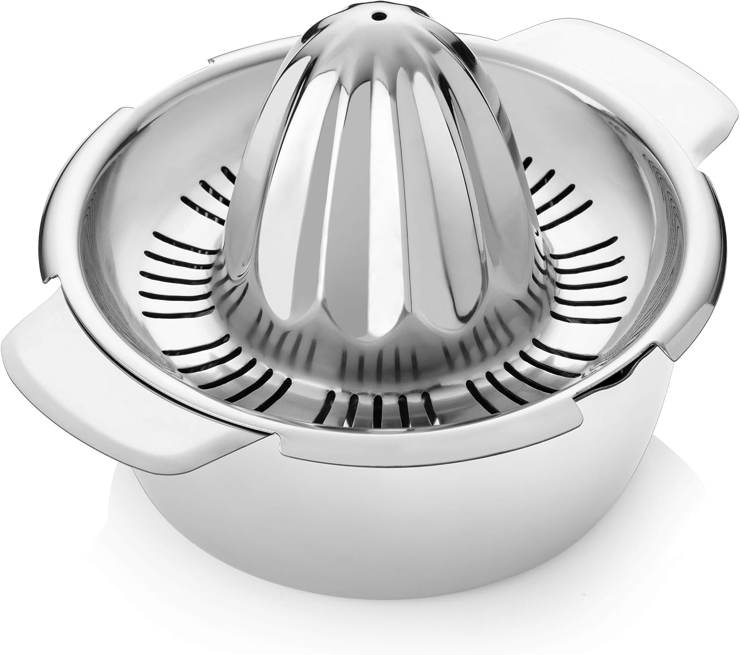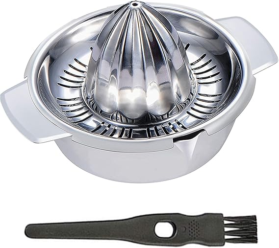 Frisch gepresster Saft in Sekunden - mit der TTSTOIEE Zitronenpresse kein Problem! Aus hochwertigem 304 Edelstahl gefertigt, ist sie nicht nur rostfrei, sondern auch super langlebig. Mit 13cm Durchmesser und 400ml Fassungsvermögen bekommst du aus Zitronen, Limetten, Orangen und Grapefruits jeden Tropfen Saft heraus. Das integrierte Filtersystem sorgt dafür, dass keine Kerne oder Fruchtstücke in deinem Drink landen - nur reiner, leckerer Saft! Der ergonomische Griff liegt perfekt in der Hand und macht das Pressen zum Kinderspiel. Nach Gebrauch einfach in die Spülmaschine stellen - praktischer geht's nicht! Das kompakte Design passt in jede Schublade und das stylische Silber sieht in jeder Küche gut aus. Ob für morgendlichen Orangensaft, erfrischende Limonade oder Cocktails - dieser Entsafter wird dein neuer Liebling in der Küche! Für alle, die gesunde Ernährung und praktische Küchenhelfer zu schätzen wissen.