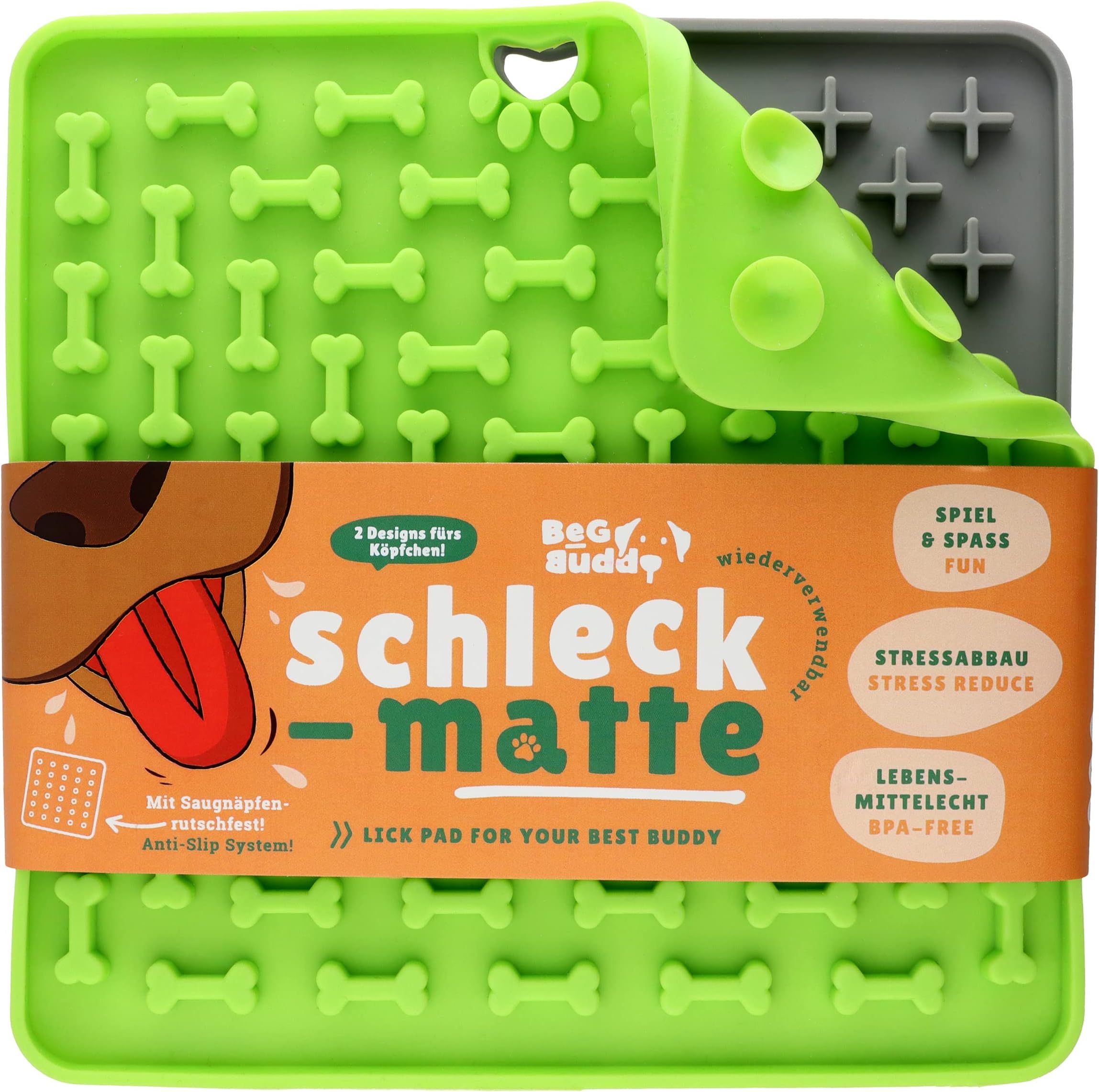 Hallo Herrchen und Frauchen! Diese geniale Leckmatte macht das Baden und Pflegen deines Hundes zum puren Vergnügen! Einfach Erdnussbutter oder Leckerlis auf die strukturierte Oberfläche streichen - schon ist dein Vierbeiner beschäftigt und entspannt. Die 34 starken Saugnäpfe halten die Matte sicher auf glatten Oberflächen wie Fliesen oder Badewanne fest. So kann sie nicht wegrutschen! Neben dem Spaßfaktor hat die Matte auch gesundheitliche Vorteile: Sie fördert die Speichelproduktion für bessere Verdauung und reinigt quasi nebenbei die Zunge. Frischerer Atem inklusive! Reinigen ist super einfach: Einfach unter fließendem Wasser abspülen oder in die Spülmaschine stecken. Das beiliegende Bürstchen hilft bei der Reinigung der Ritzen. Perfekt für angstfreies Baden, Krallenschneiden oder einfach zur Beschäftigung. Dein Hund wird's lieben - und du auch, weil alles viel entspannter abläuft! Einfach befeuchten, aufsaugen lassen und den Magic Moment genießen!