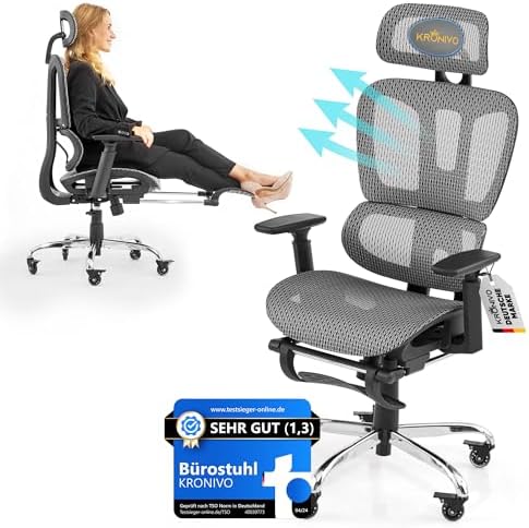Sitzkomfort auf Profiniveau! Der Ya-Home Bürostuhl bietet alles für gesundes und ermüdungsfreies Sitzen. Die verstellbare Lendenwirbelstütze mit 3-Zonen-System reduziert den Druck im unteren Rücken um bis zu 50%. Die 3D-Kopfstütze und 4D-Armlehnen passen sich deiner Körperhaltung an. Besonders praktisch: Die ausziehbare Fußstütze und die neigbare Rückenlehne (90°-135°) ermöglichen entspannte Pausen. Die atmungsaktive Mesh-Rückenlehne und das Kaltschaum-Sitzkissen sorgen für optimales Klima und Entlastung. Zertifiziert nach SGS/TUV/BIFMA, bis 150 kg belastbar. Der stabile Metall-Fünffuß mit Rollen passt auf alle Bodenbeläge. Einfache Montage in wenigen Schritten - inklusive Werkzeug und Anleitung. Farbe: Grau. Perfekt fürs Homeoffice oder den Arbeitsplatz - mach dir das Sitzen so angenehm wie möglich!